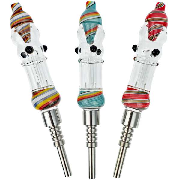 The 4-inch Glass Nectar Straw is a compact dab straw built for concentrate enthusiasts who want portability without sacrificing heat retention. Featuring a screw-on titanium tip and hand-blown glass body with color accents, this pocket-friendly piece delivers clean, flavorful hits while fitting easily in your palm or stash bag.