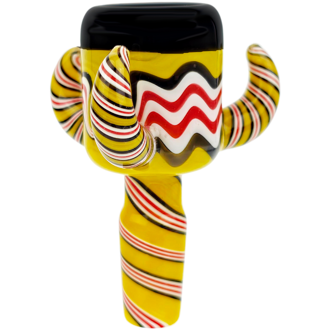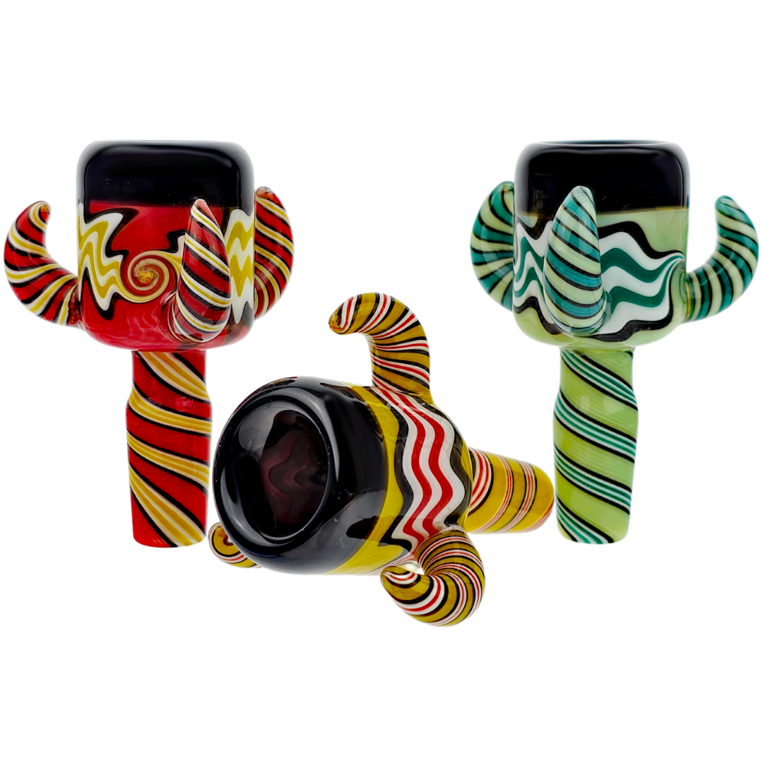 The Tri Horn Full Color Spiral Flower Bowl is a 14mm glass bowl built for smokers who want grip, color, and a bowl that won't roll off the table. Three horn-shaped grips along the rim give you a solid hold when the glass is hot, while the spiral design and full-color glass make it more than just another replacement bowl. At 3.5 inches, it's compact enough to stay out of the way but deep enough to pack a decent session.