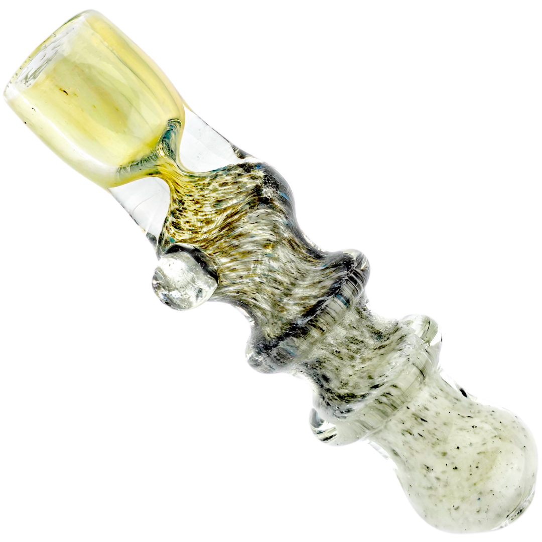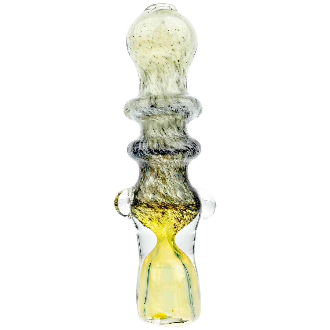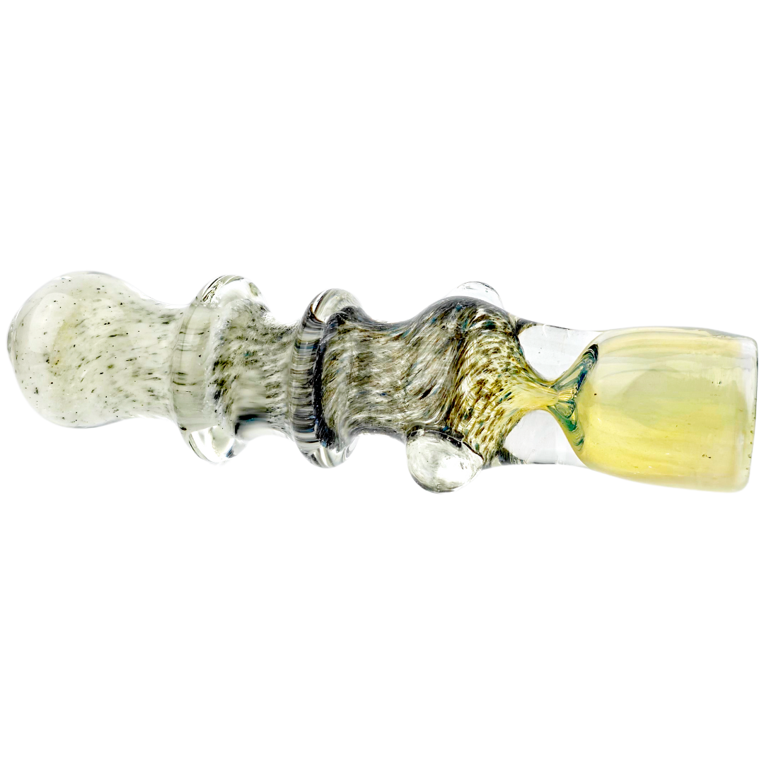 The 3.5" Double Maria Fume Chillum is a compact glass hand pipe for quick flower sessions when you don't want to fuss with a full setup. Two decorative glass rings (maria) give you grip points that actually matter when you're passing it around, while the black-and-white frit work shifts color as you use it — that fumed glass patina some people chase for months. At under four inches, it disappears into a pocket or small stash bag without the bulk of a spoon pipe.