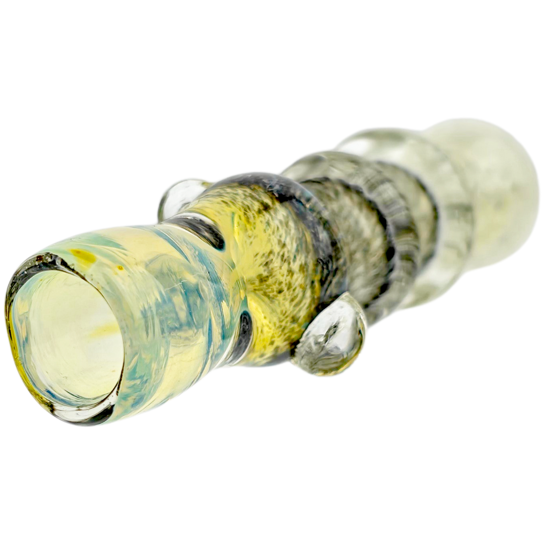 Maria (sometimes called marbles or donuts) are decorative glass bands wrapped around the pipe body. On this chillum, the double maria adds two textured grip points so you're not fumbling when the glass is warm or slippery. They also create slight ridges that prevent the piece from rolling off tables — a small detail that matters more than you'd think.