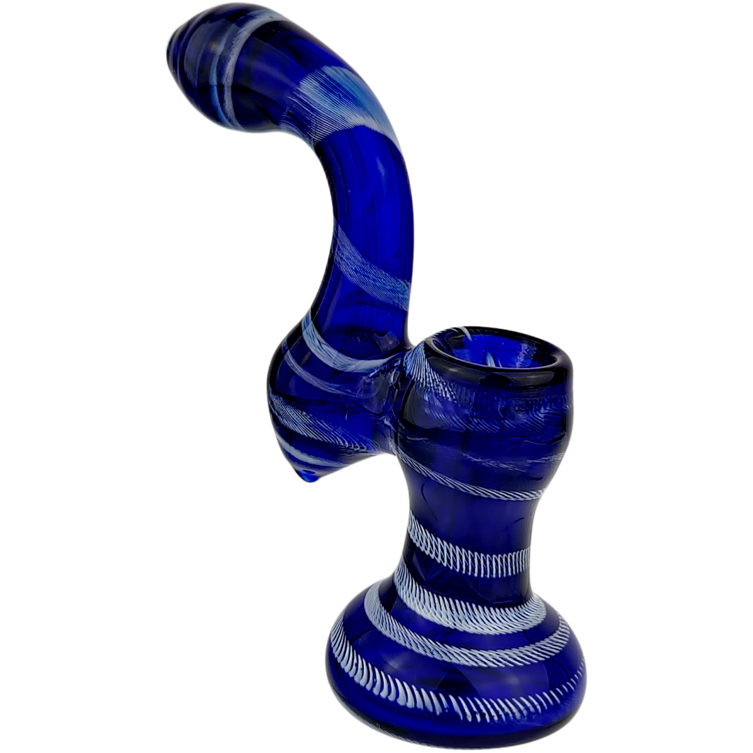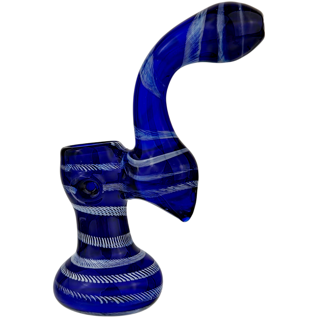 The colored body with white linework gives this bubbler that heady-glass look without the collector price tag. Because the colorways vary, you end up with something that doesn’t feel mass-produced, more like a piece you picked from a case in a local shop. The shape is classic: fixed bowl, integrated downstem, and a mouthpiece that angles up so you’re not ducking down over the table to hit it.