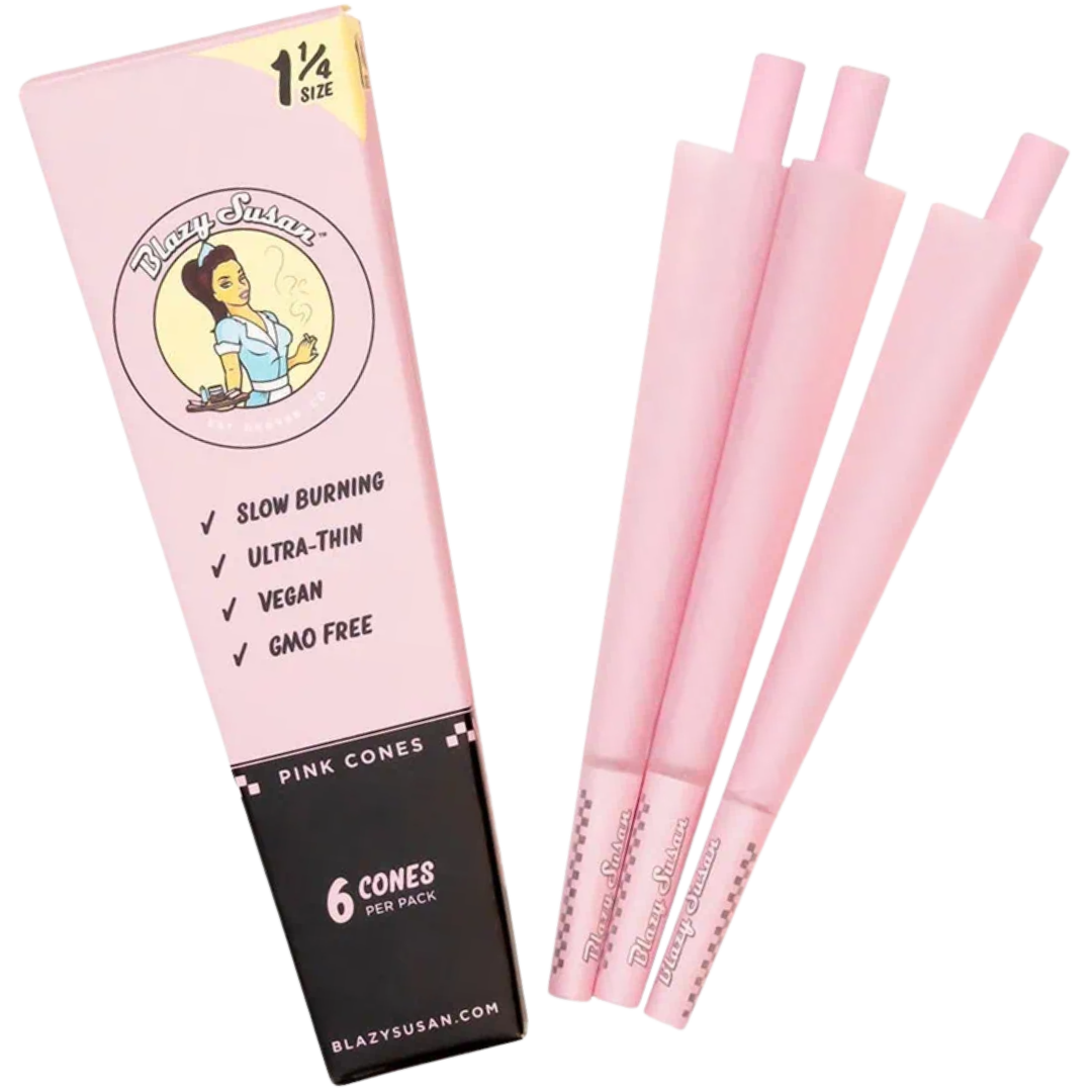 The Blazy Susan Pink Paper Cones are pre-rolled 1¼ size cones built for people who want their smoking sessions to stand out. Six pink cones per pack (split into two stacks of three), plus eco-friendly pink packing straws so you can load them without hassle. If you've been grabbing basic browns or whites, this is what happens when someone actually thinks about the aesthetic.