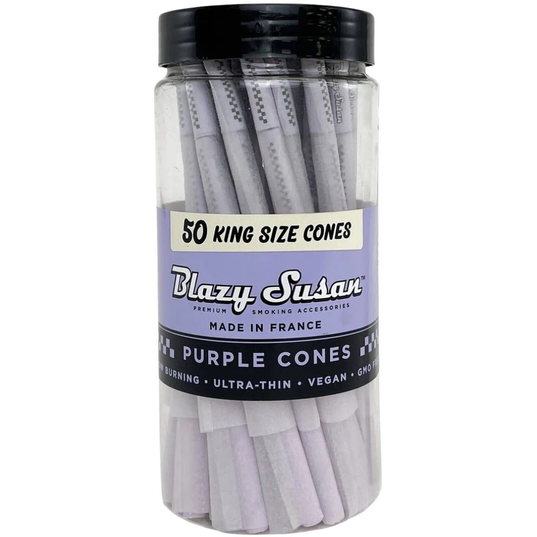 The Blazy Susan Purple Paper Cones are king size pre-rolled cones made from ultra-thin, vegan paper that burns slow and even. Built for smokers who want a reliable roll without the hassle of packing, these cones come ready to fill — just pack your flower, twist the top, and light up. The 50-count box keeps you stocked for weeks, and the purple paper adds a little color to your rotation without messing with the flavor.