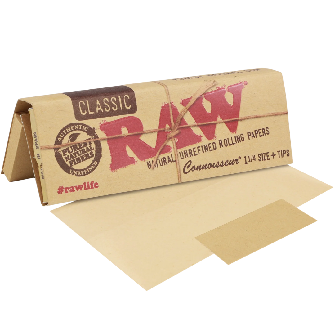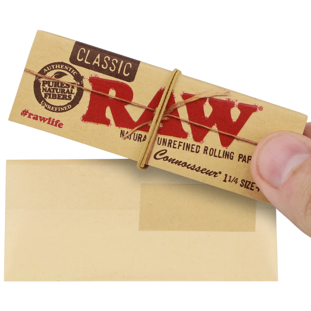 The RAW Classic Connoisseur 1¼ Rolling Papers with Tips is a complete rolling kit built for people who want everything in one pack — papers, tips, and nothing else to hunt down. You get 50 leaves of unbleached rolling paper plus 50 filter tips, held together with an elastic band so the tips don't disappear into your bag. It's the 1¼ size, which means slightly longer than the standard 1-inch papers, giving you more room to work with without jumping up to king size.