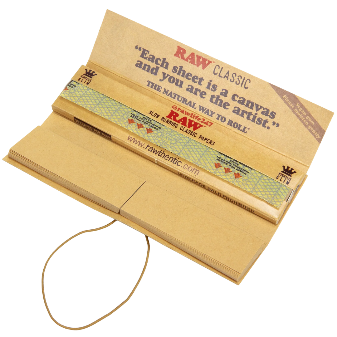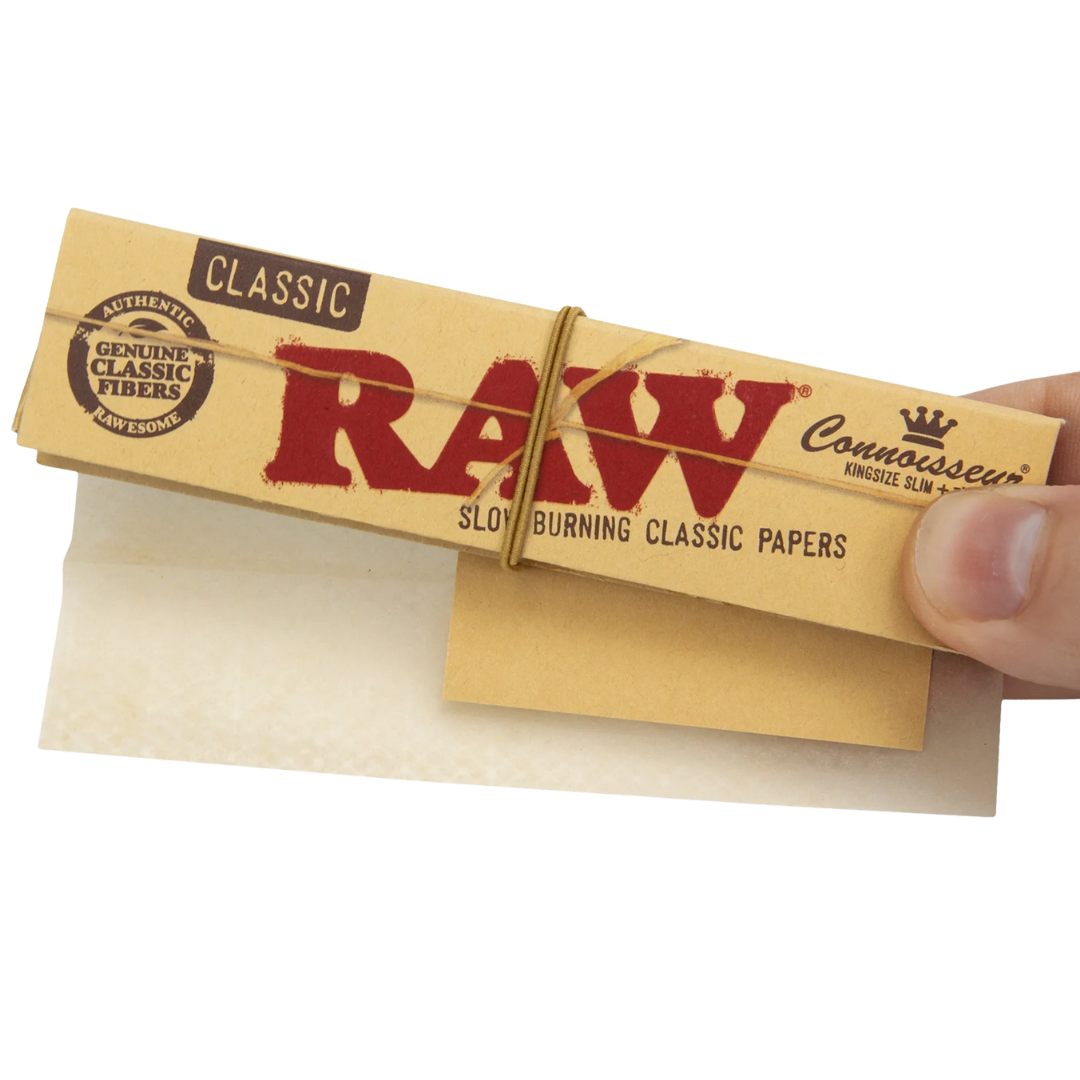 RAW papers burn slowly because of the natural fibers and the watermark pattern pressed into the sheet. You'll notice less canoeing (uneven burn) compared to bleached papers. Store unused packs in a cool, dry spot — humidity makes any paper harder to work with. The elastic band holding each Connoisseur pack together keeps papers and tips from getting separated in your bag or stash box.