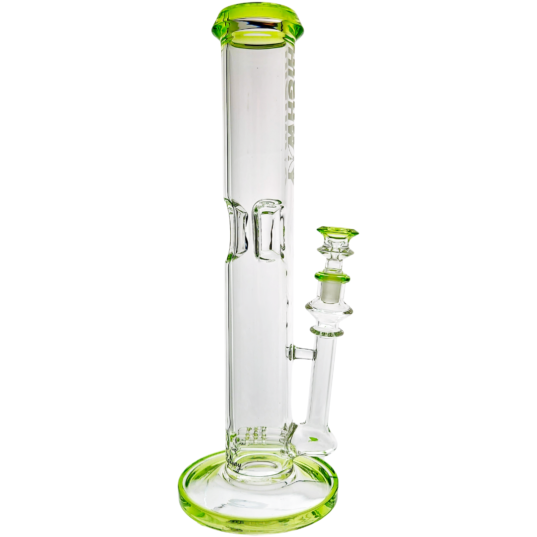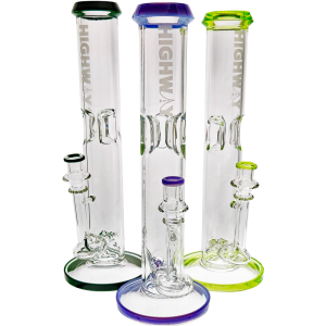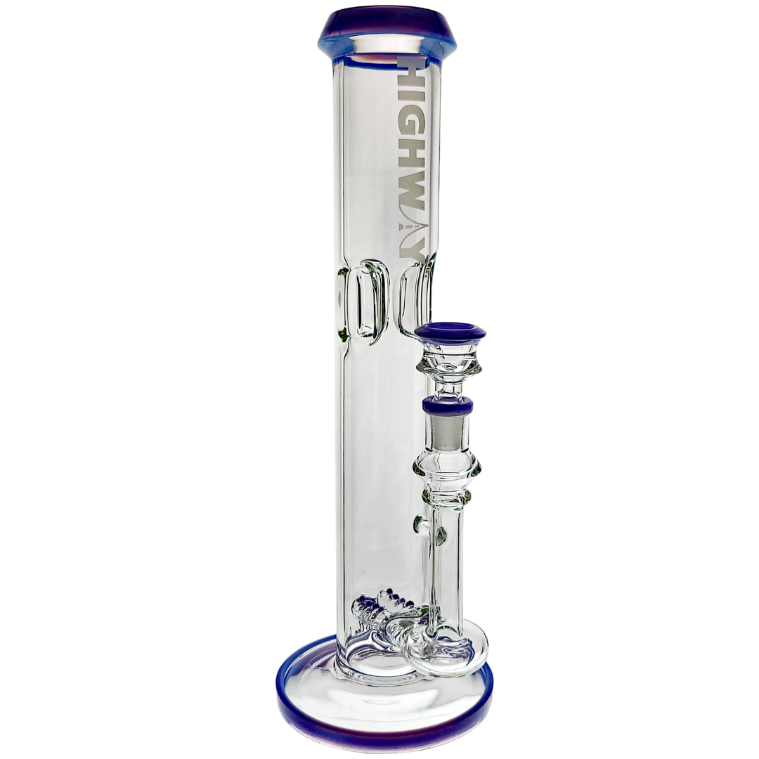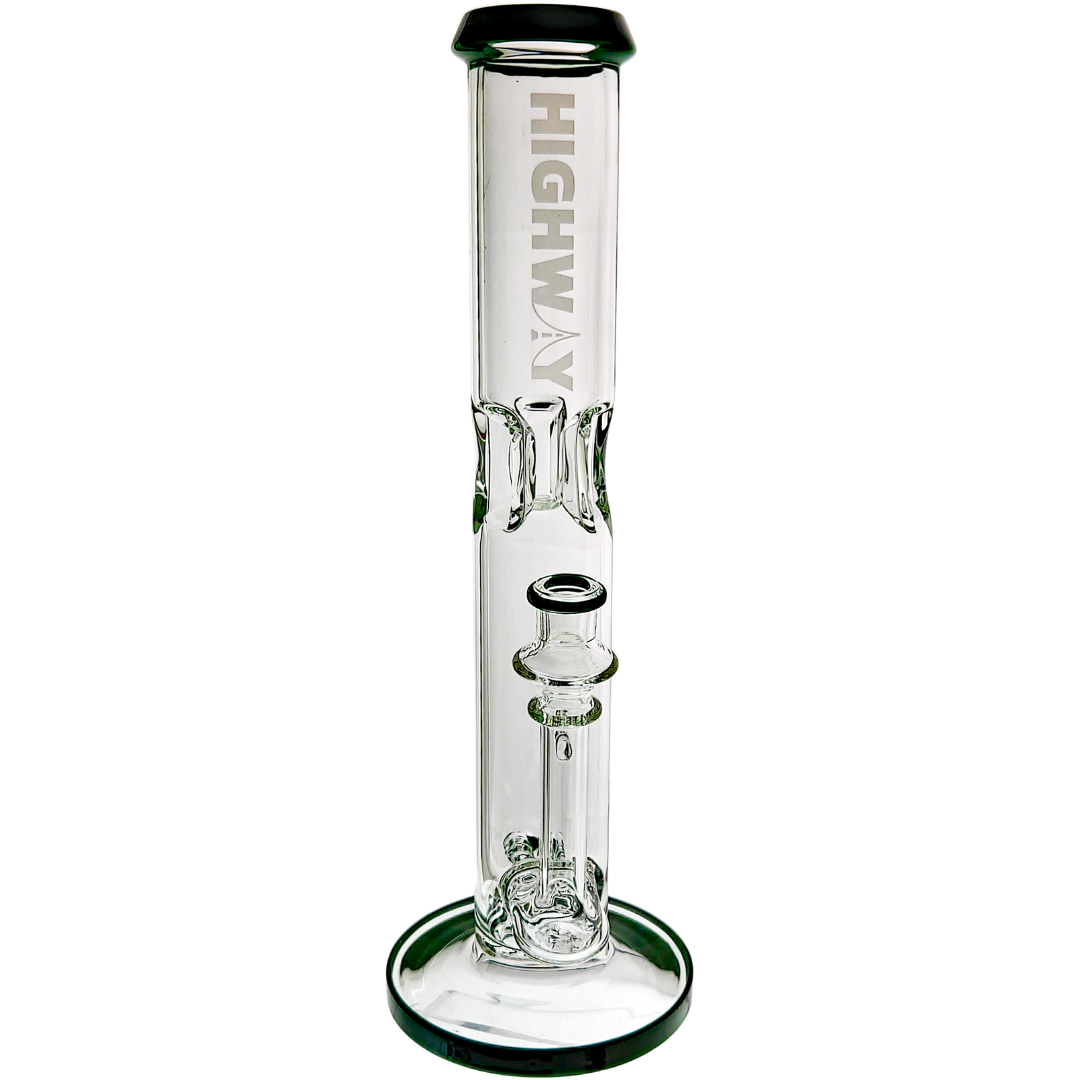The 14" Highway Color Accent Twin Turbo Straight is a tall, heavy-hitting glass bong built for flower lovers who want super-smooth pulls without giving up punch. It stacks two inline percs in a straight-tube body, so your hits get serious diffusion before they touch your lungs. With color accents on the lip, base, joint, and matching 14mm flower bowl, it’s a statement piece that actually rips, not just something pretty on the shelf.