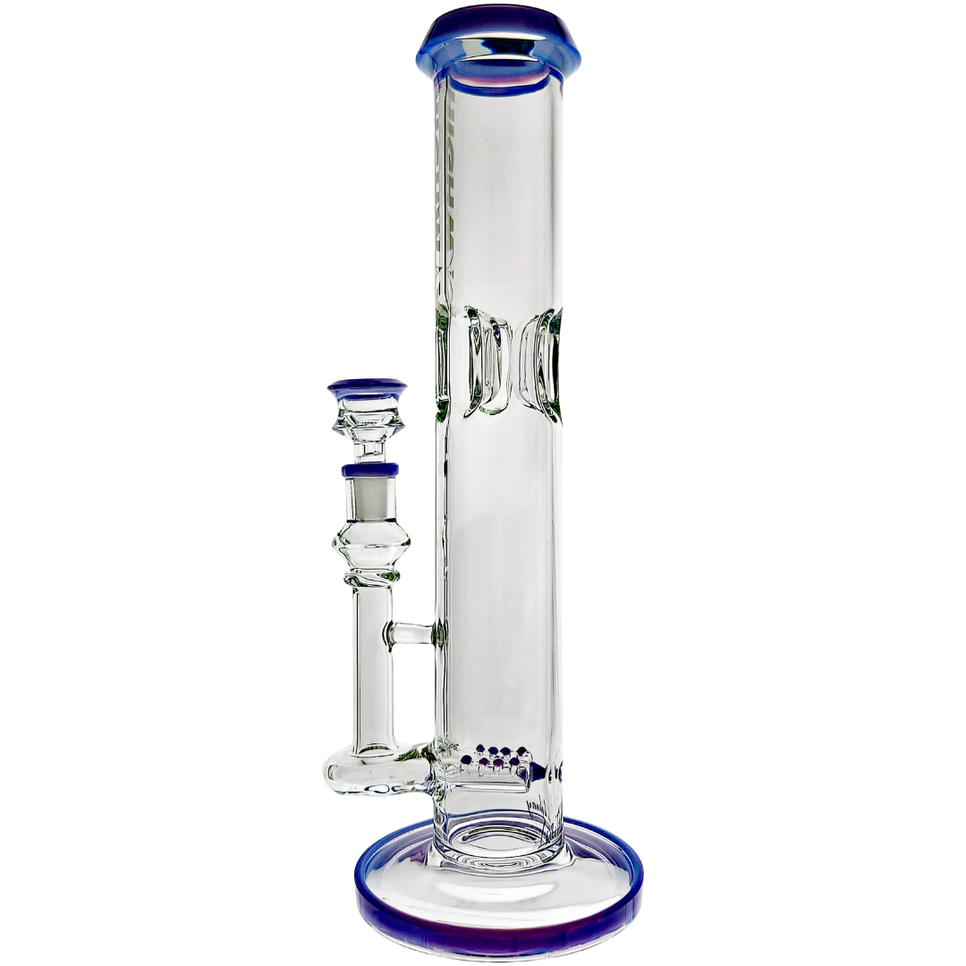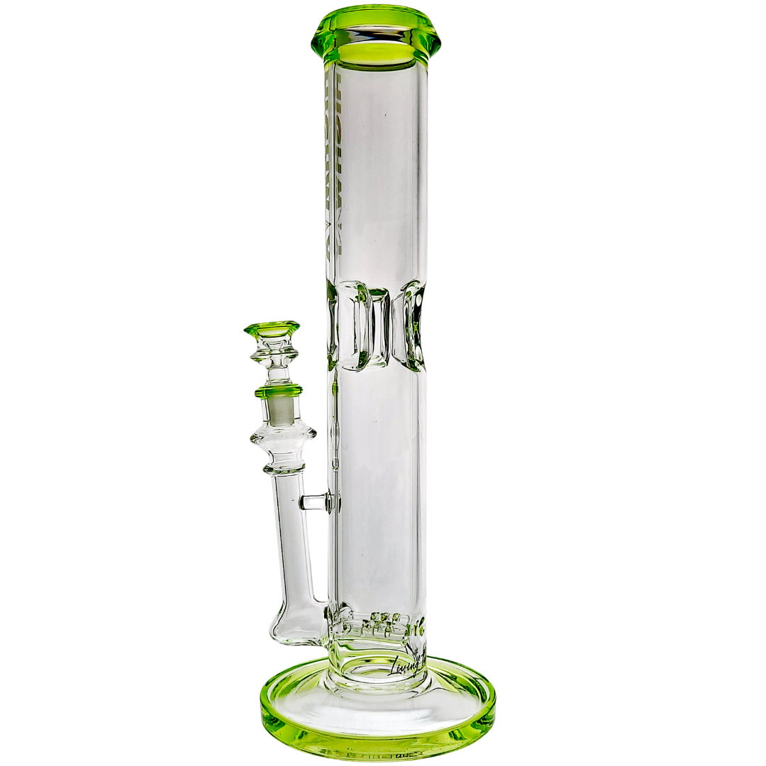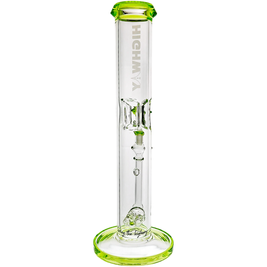 The 14" Highway Color Accent Twin Turbo Straight is a tall, heavy-hitting glass bong built for flower lovers who want super-smooth pulls without giving up punch. It stacks two inline percs in a straight-tube body, so your hits get serious diffusion before they touch your lungs. With color accents on the lip, base, joint, and matching 14mm flower bowl, it’s a statement piece that actually rips, not just something pretty on the shelf.