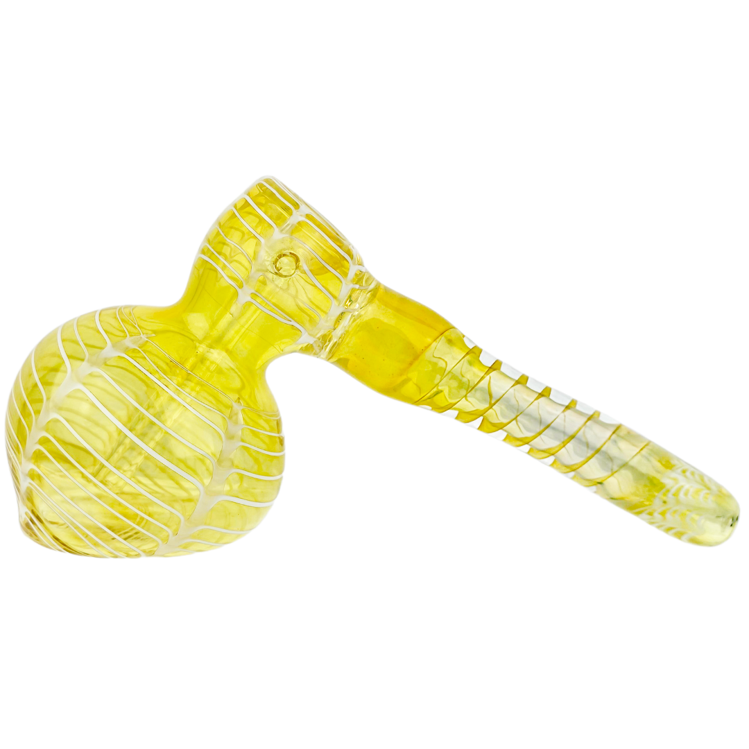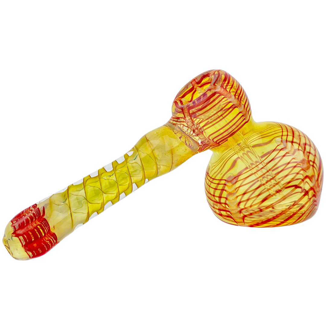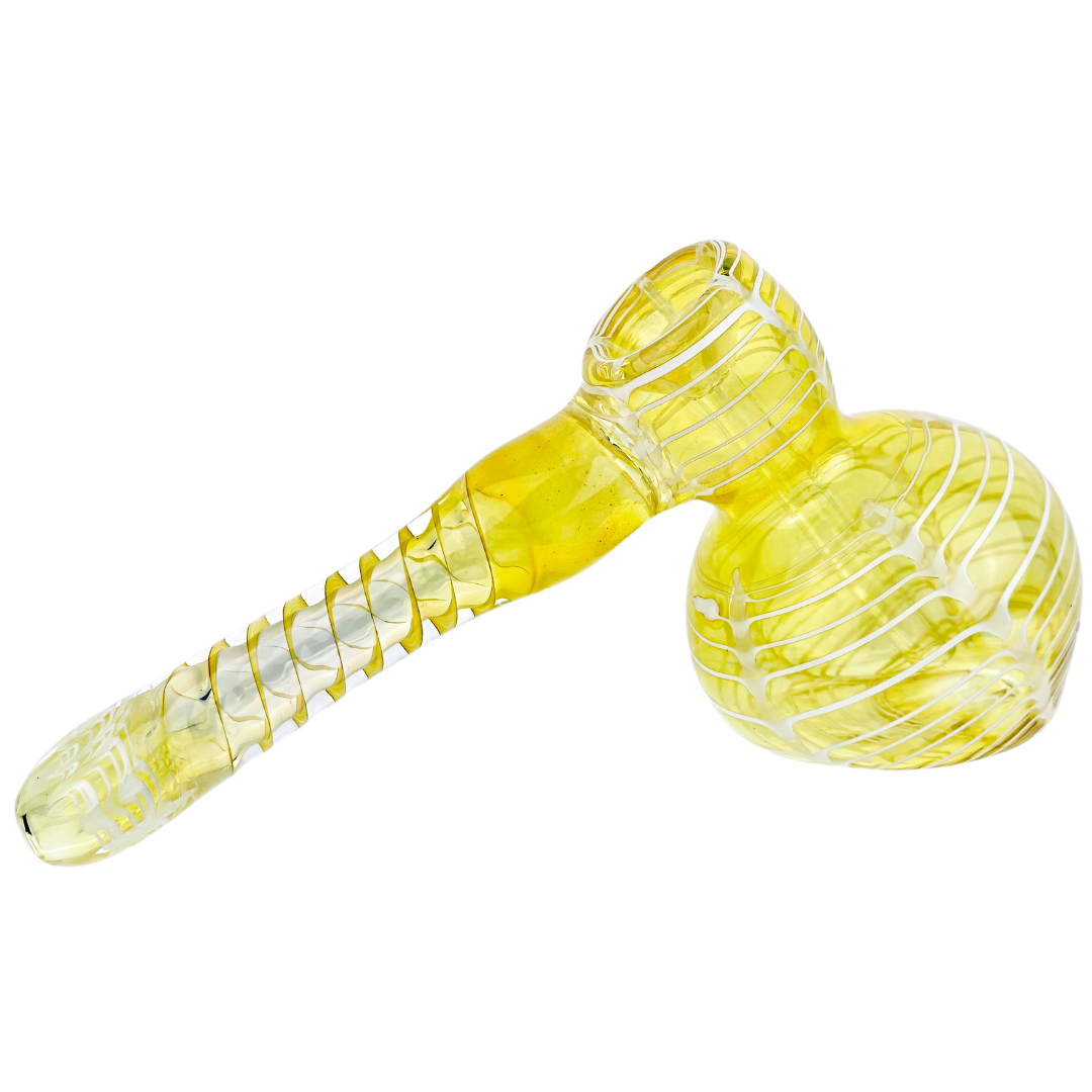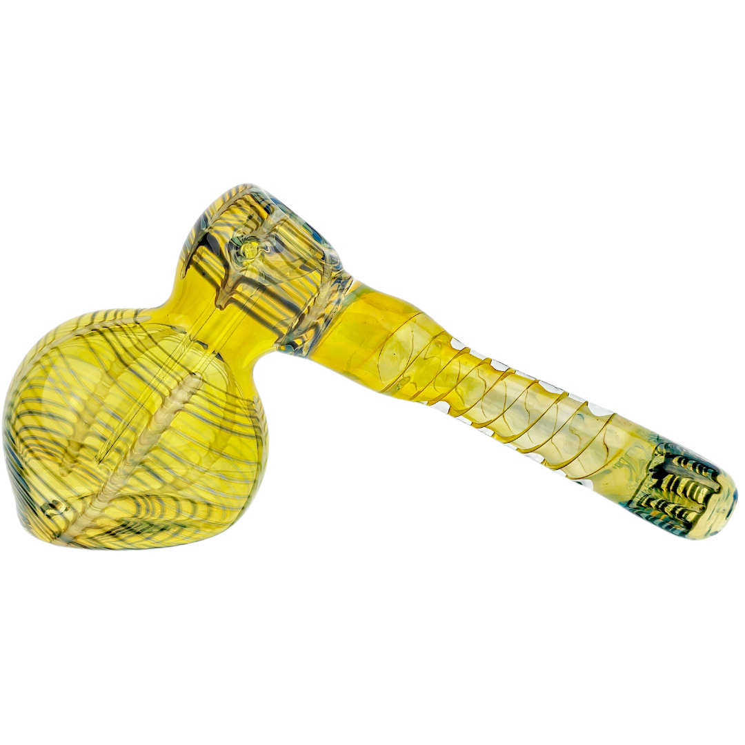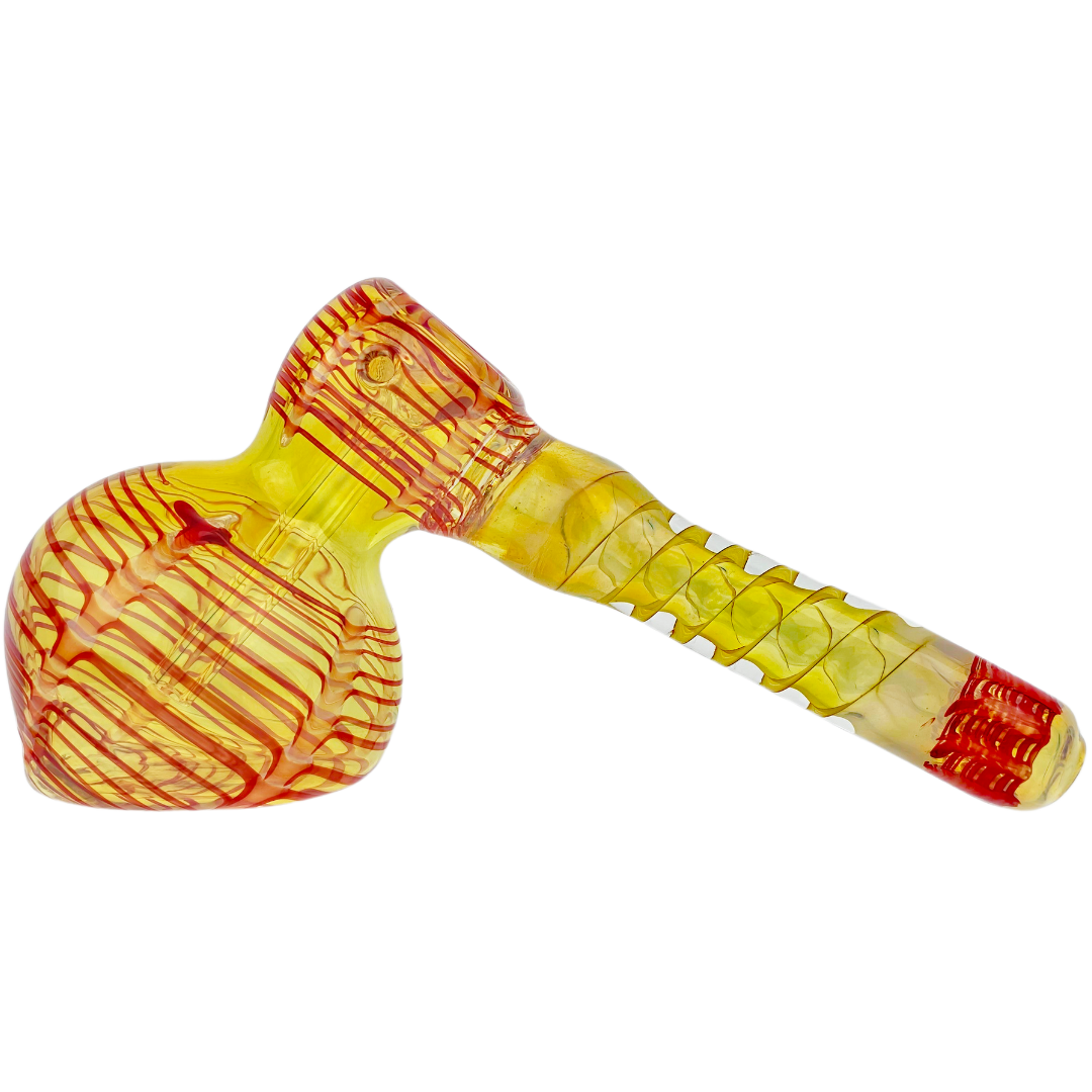The 7-inch Fume Wrap & Rake Hammer Bubbler is a compact glass water pipe built for flower smokers who want smooth hits without the bulk of a full-size bong. The hammer-style base sits flat on any surface, while the fume wrap and rake detailing on the mouthpiece and body add hand-blown color accents that make each piece unique. At 7 inches, it's portable enough for solo sessions but substantial enough to deliver proper water filtration.