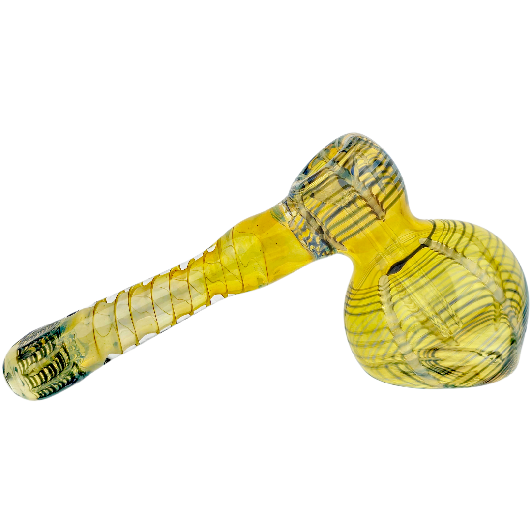 The fume wrap is created by vaporizing silver or gold onto the hot glass during the blowing process, which creates iridescent color shifts. The rake technique drags contrasting colors across the body and mouthpiece, creating swirled patterns. Both methods mean no two pieces look identical, and the colors deepen as resin builds up with use.