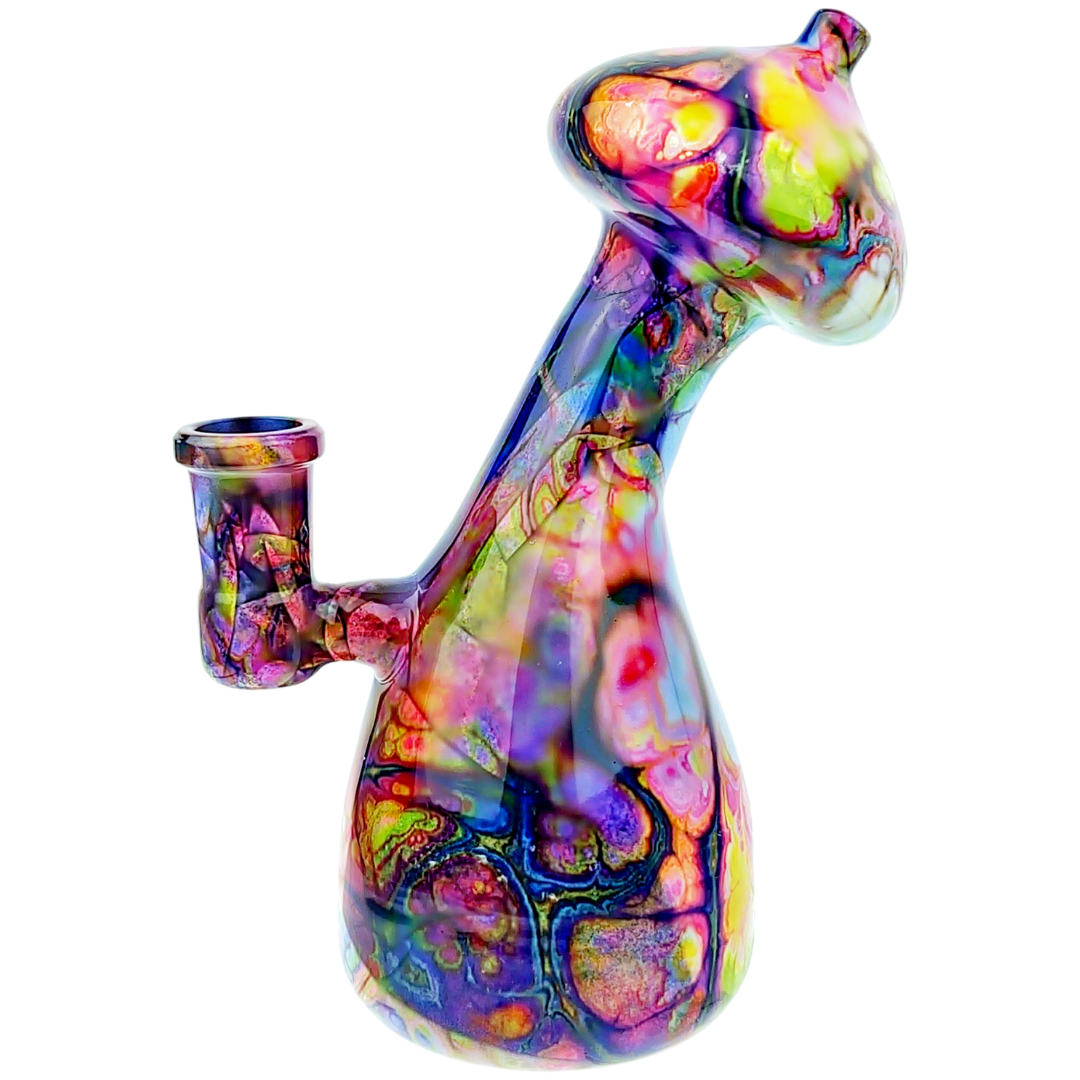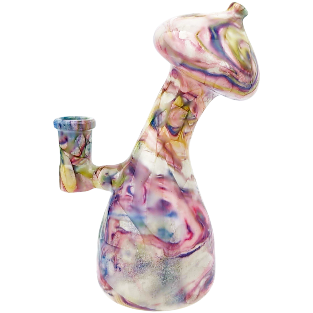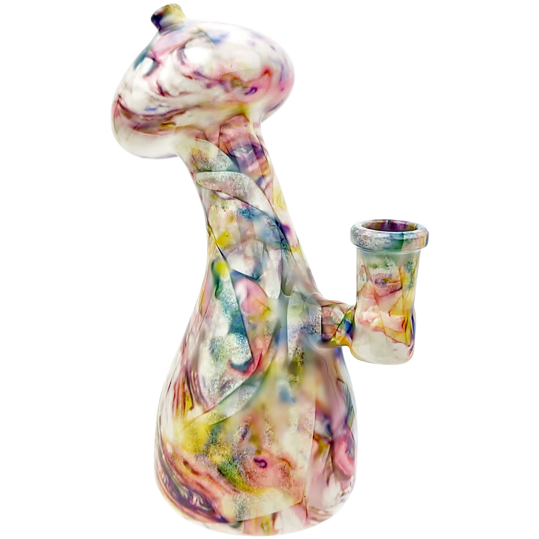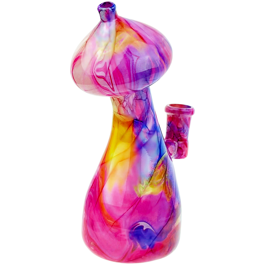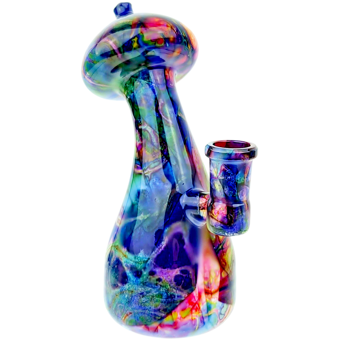 The mushroom sculpting isn't just decorative. The extra glass mass around the design helps with heat dissipation and adds stability to the base. Watercolor glass gets its name from the way artists blend colors during the glassblowing process, creating organic swirls that look almost painted on. Each piece comes out slightly different because of how the colors move and settle.