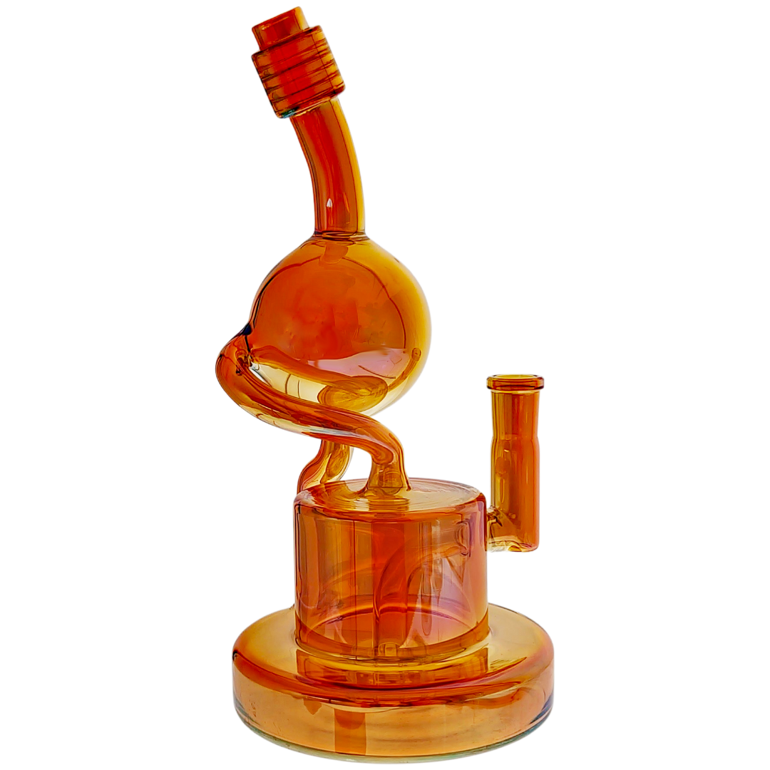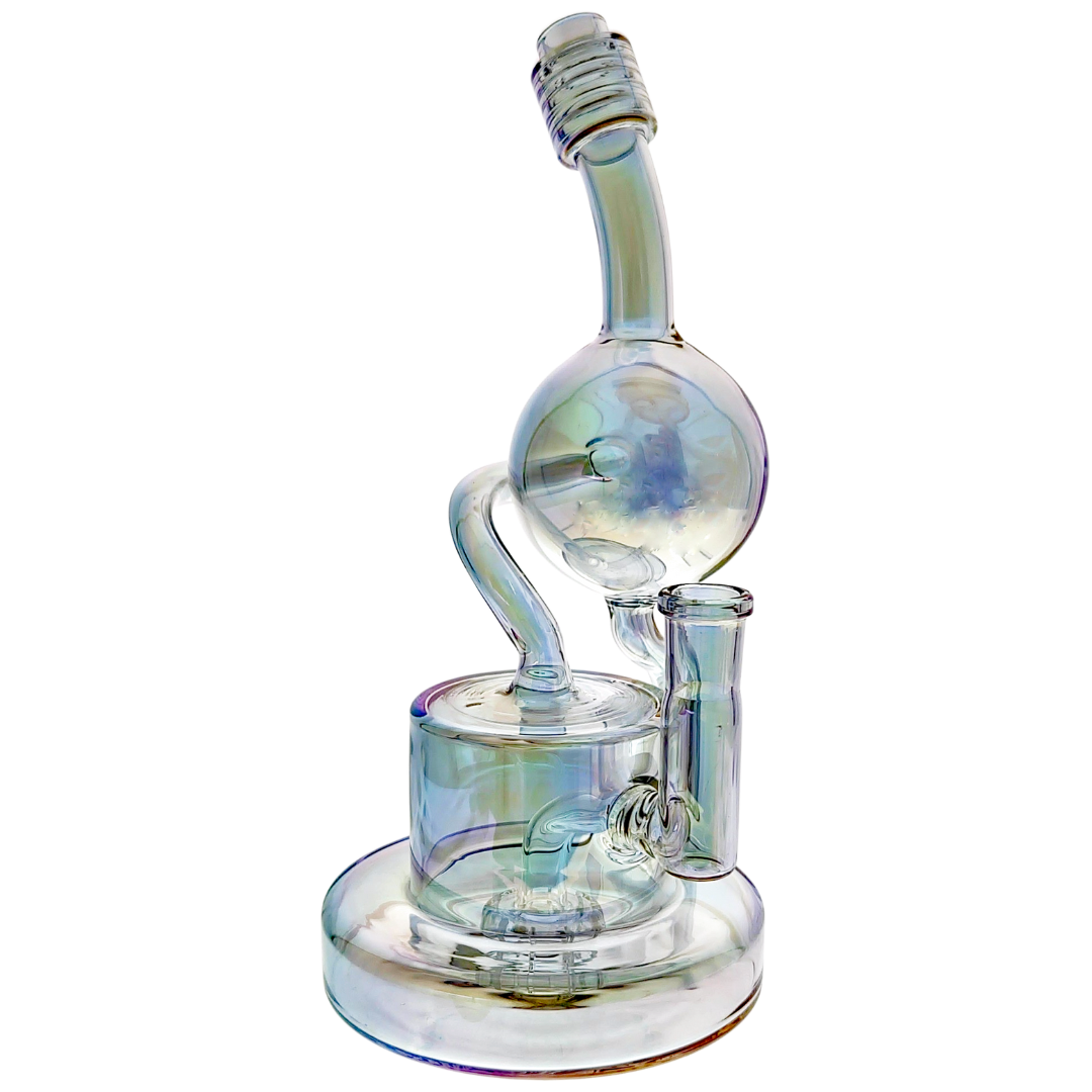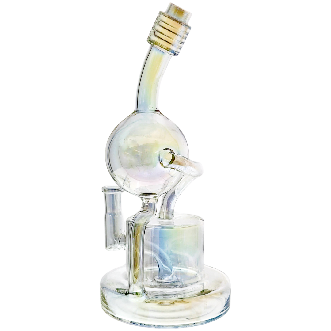 The 9.5-inch Iridescent Orb Puck Base Recycler is a compact glass dab rig built for concentrate enthusiasts who want smooth, flavorful hits without the bulk of larger setups. The recycler design continuously cycles water through the piece, cooling vapor multiple times before it reaches your lungs. Comes ready to use with a 14mm male 90-degree quartz banger included, so you can start dabbing right out of the box.