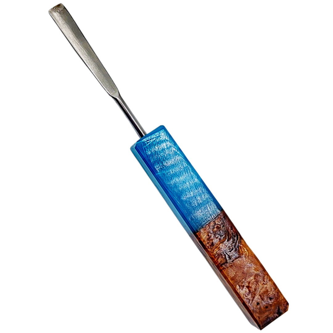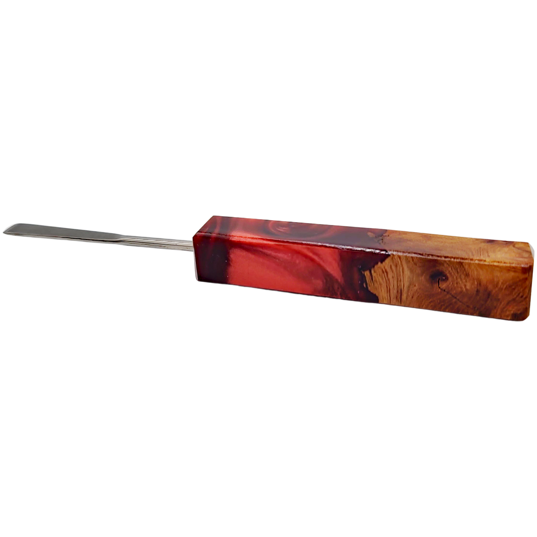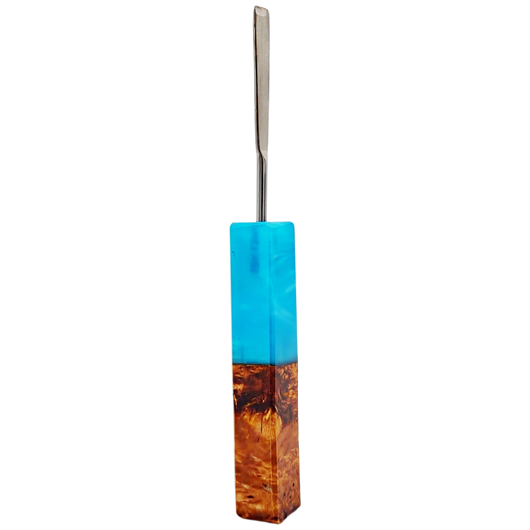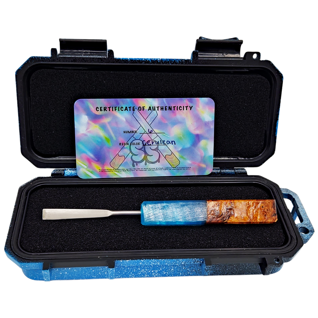 The Miyagi Paints Square Sesh Sceptor is a handcrafted dab tool built for collectors and daily dabbers who want function wrapped in genuine artistry. Each piece combines natural wood burl with deep amethyst-colored resin, creating a one-of-a-kind handle that feels as good as it looks. The squared profile keeps it stable in your grip and prevents rolling when you set it down between dabs.