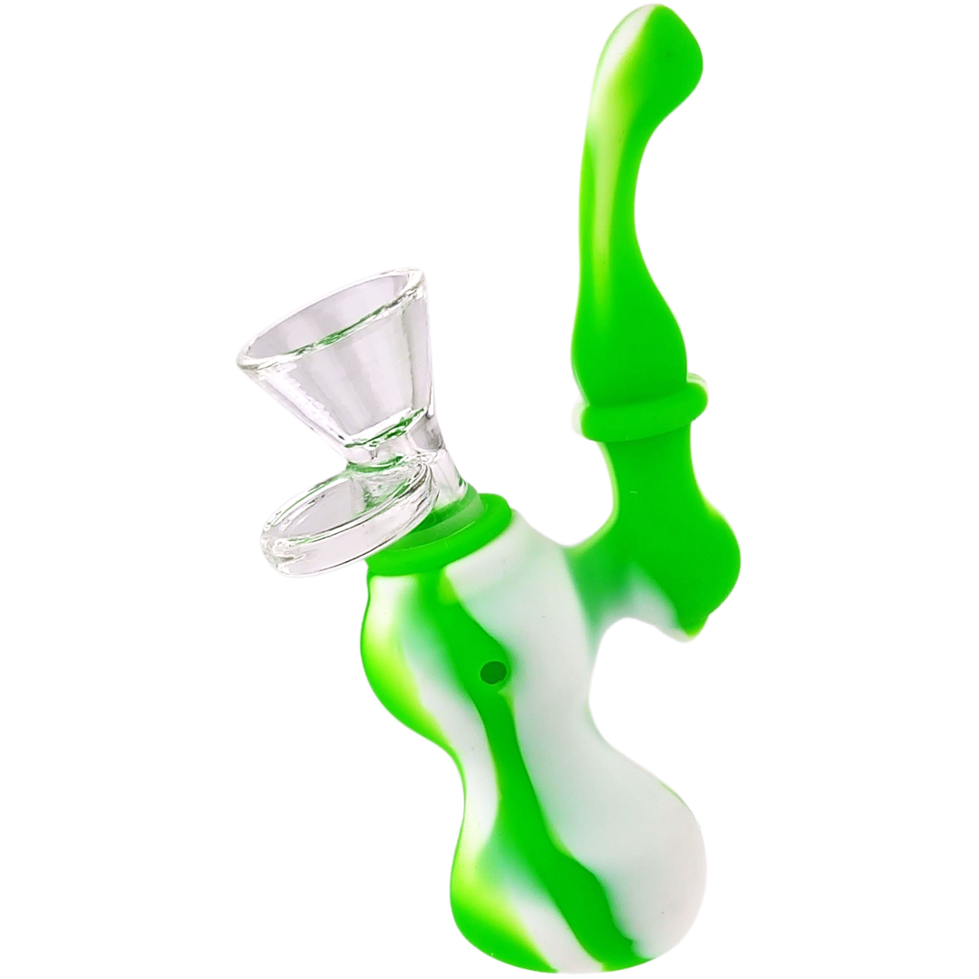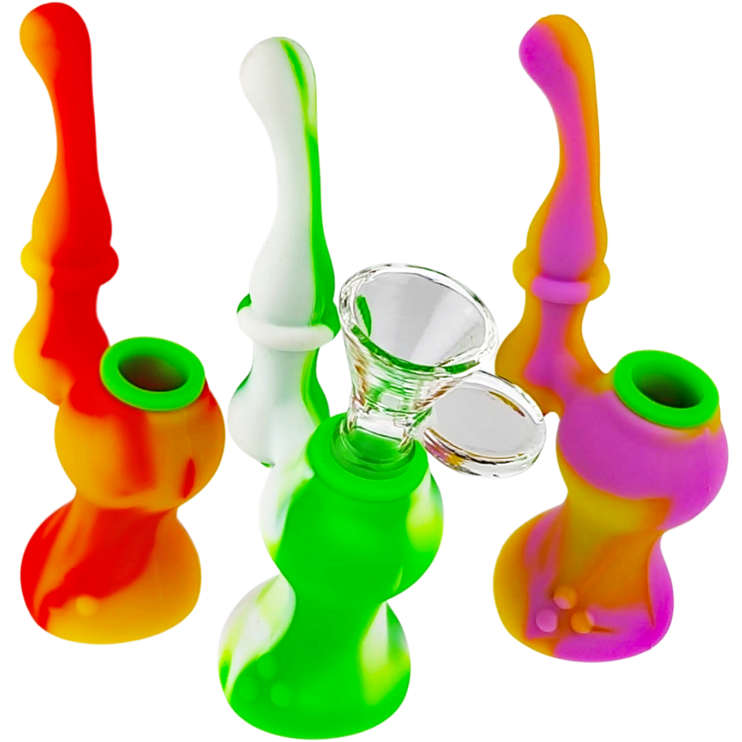 The 5-Inch Silicone Character Bubbler is a compact, unbreakable water pipe built for flower smokers who want portability without the stress of carrying glass. Silicone construction means you can toss it in a bag, drop it on concrete, or leave it at a friend's place without worrying. Comes with a glass flower bowl, stands 5 inches tall, and features a playful robot-inspired decal design that brings a little personality to your daily rotation.