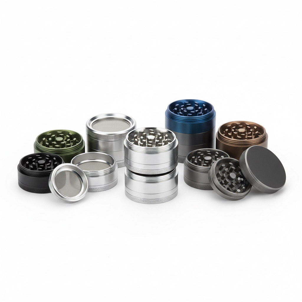 We carry 2-piece, 4-piece, and electric grinders in aluminum, zinc alloy, and stainless steel. Two-piece grinders are the simplest: twist, grind, dump. Four-piece grinders add a kief screen and collection chamber so fine trichomes accumulate over time for a potent bonus. Electric grinders handle the work for you at the push of a button, which is useful for people with grip strength issues or anyone processing large quantities.