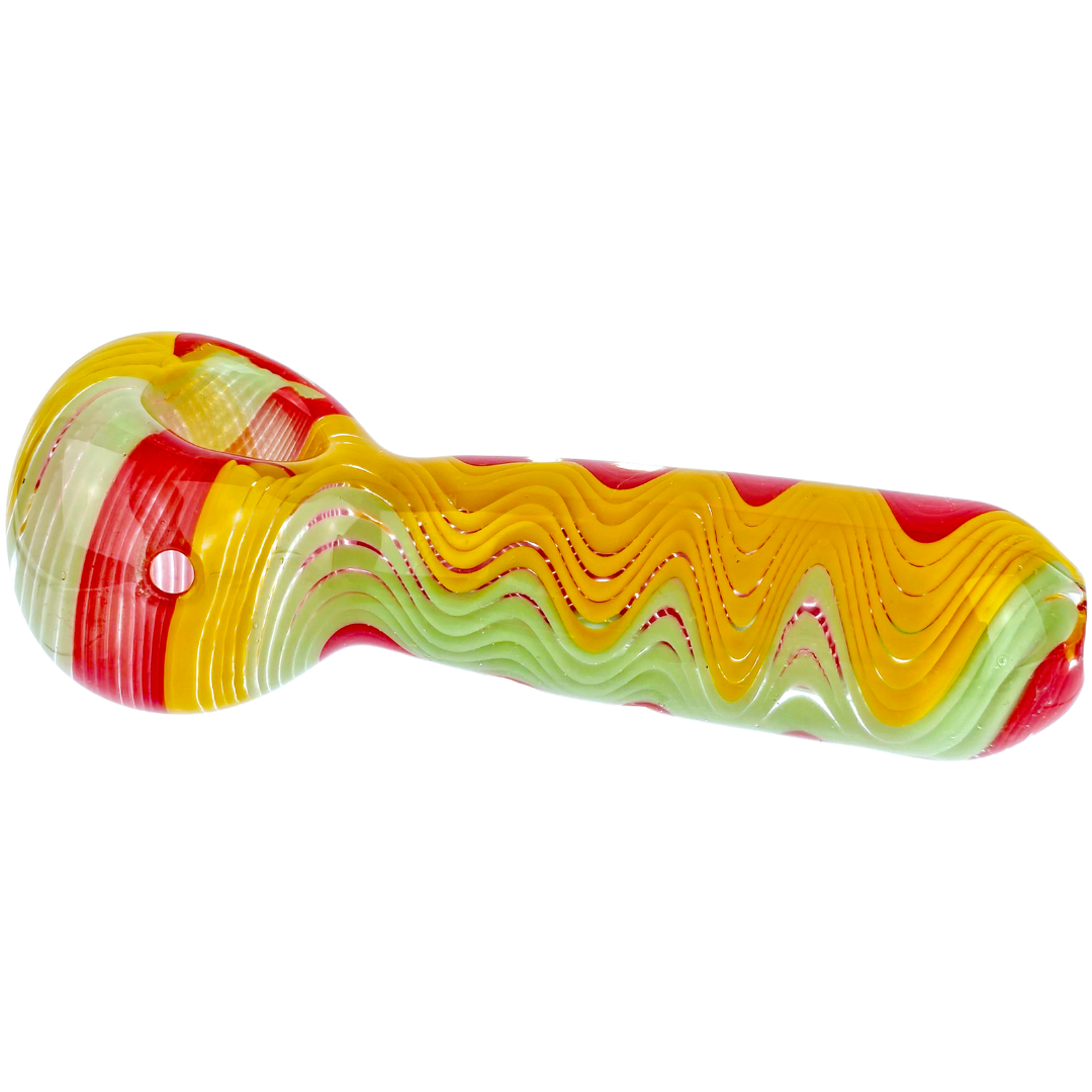 The 4.5 Inch Rasta Wave Line Hand Pipe is a compact glass spoon pipe built for flower smokers who want something portable and easy to use. The Rasta-colored wave pattern gives it a classic look, while the short 4.5 inch length makes it pocket-friendly without sacrificing a solid bowl size. At this price point, it's a daily driver that doesn't hurt to replace if something happens.