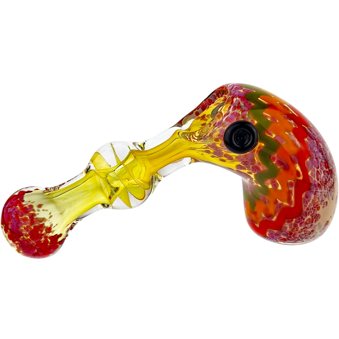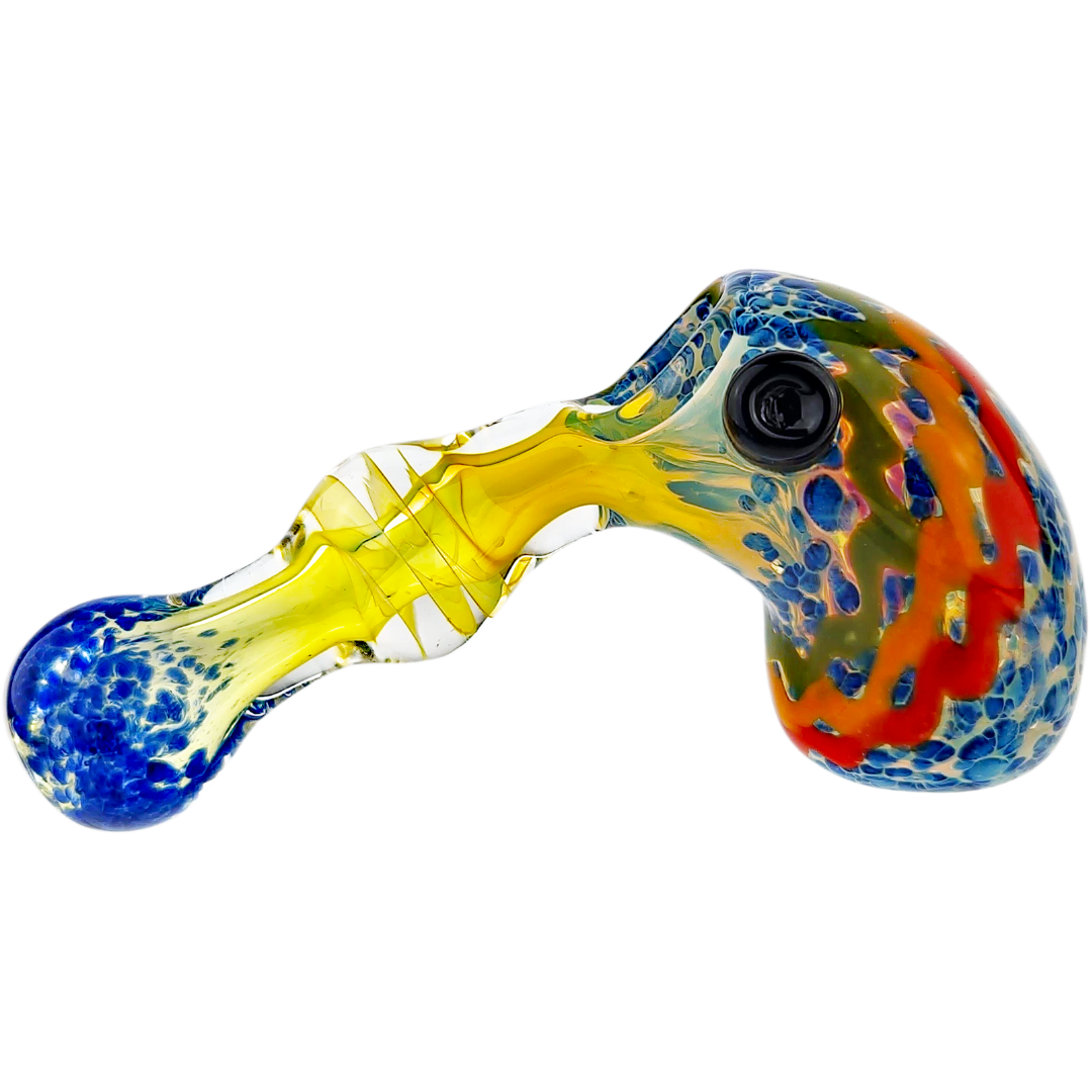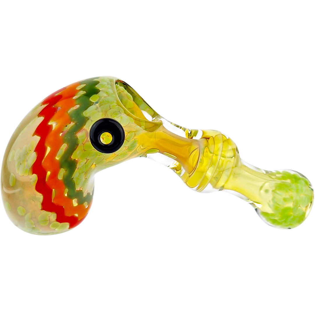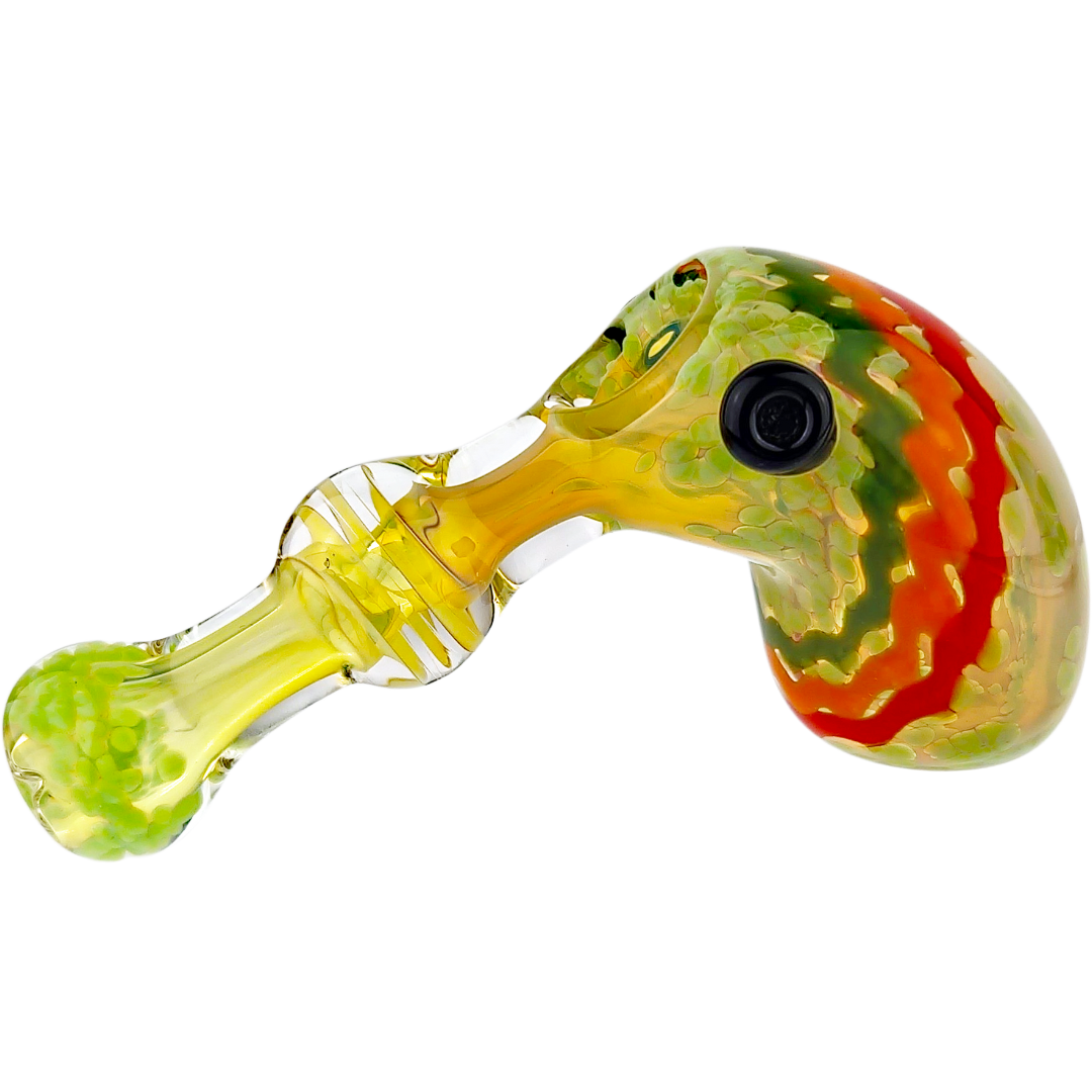 The 5" Rasta Fume Glass Hand Pipe is a medium-sized spoon pipe for flower smokers who want something with actual visual character without dropping art-glass money. At 5 inches (127mm), it sits in that goldilocks zone — big enough to hold comfortably and pack a proper bowl, small enough to slip into a pocket or case when you're heading out. The Rasta fume work gives it layered color depth that shifts depending on how light hits it, and the glass actually develops more character as you use it.