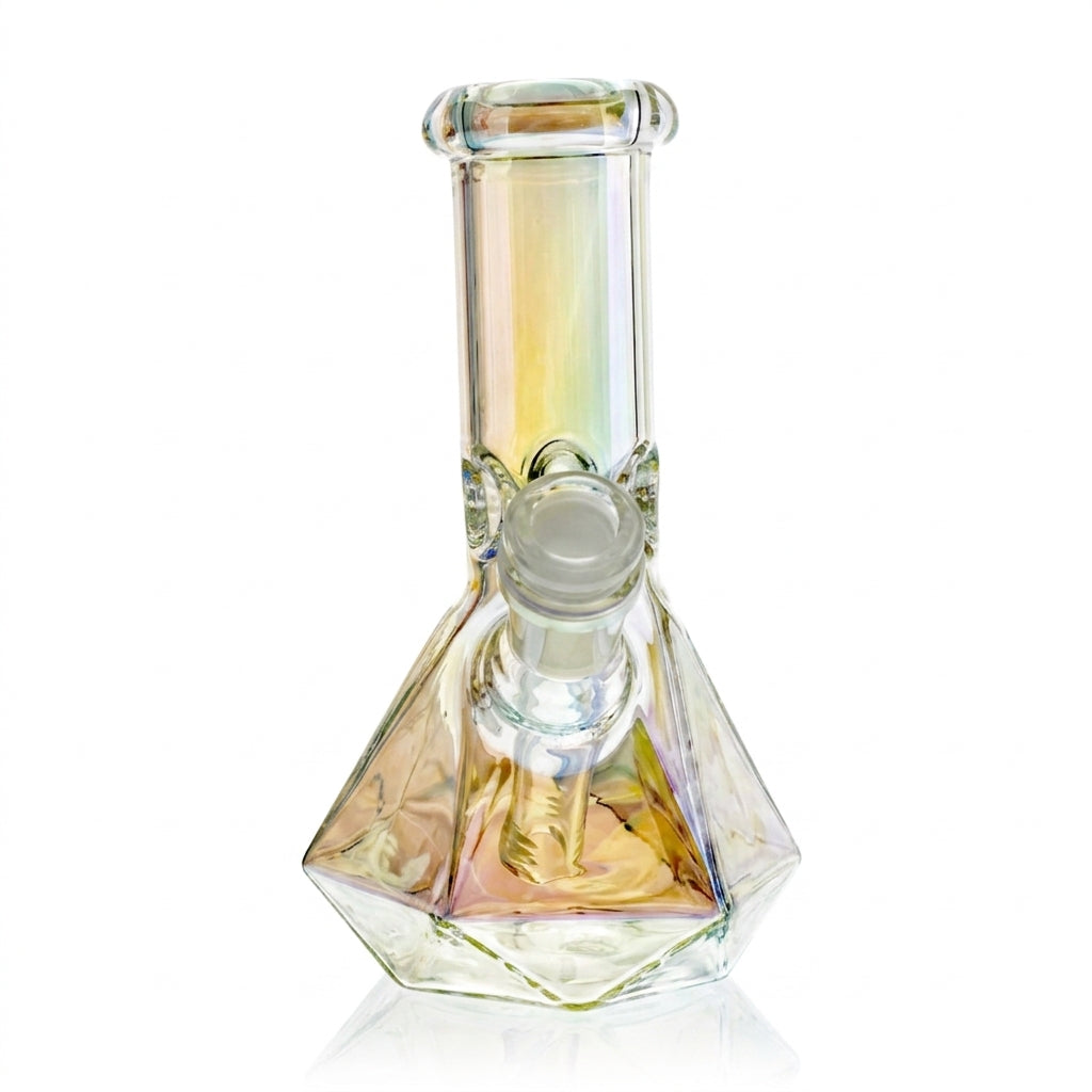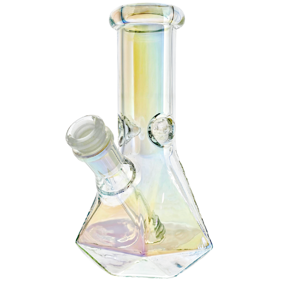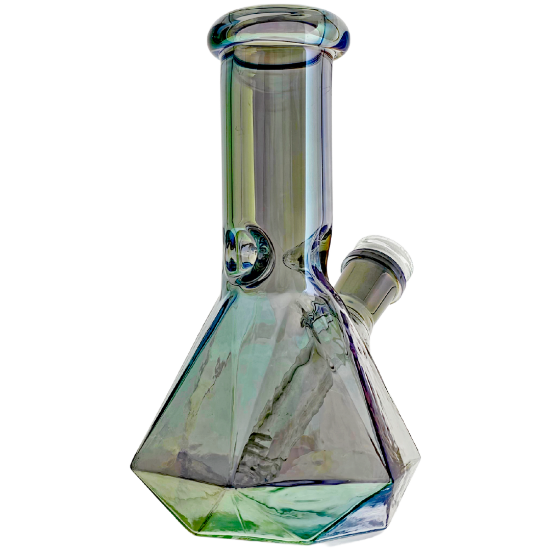 A 6.5-inch beaker bong that brings the classic wide-base stability you expect, with a geometric faceted neck and an iridescent finish that shifts color depending on the light. Compact enough to keep on a side table, tall enough to diffuse smoke properly with a standard downstem.