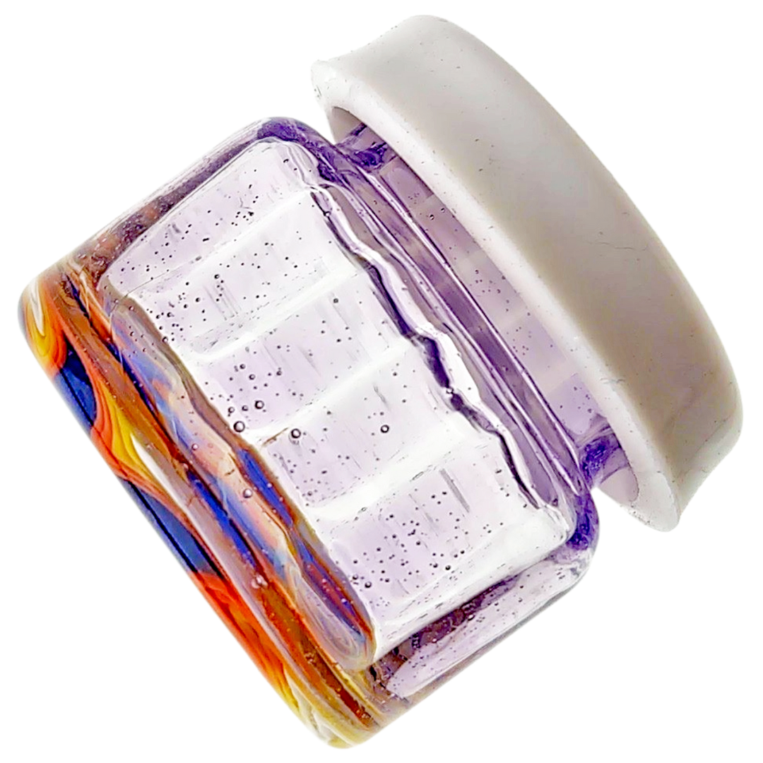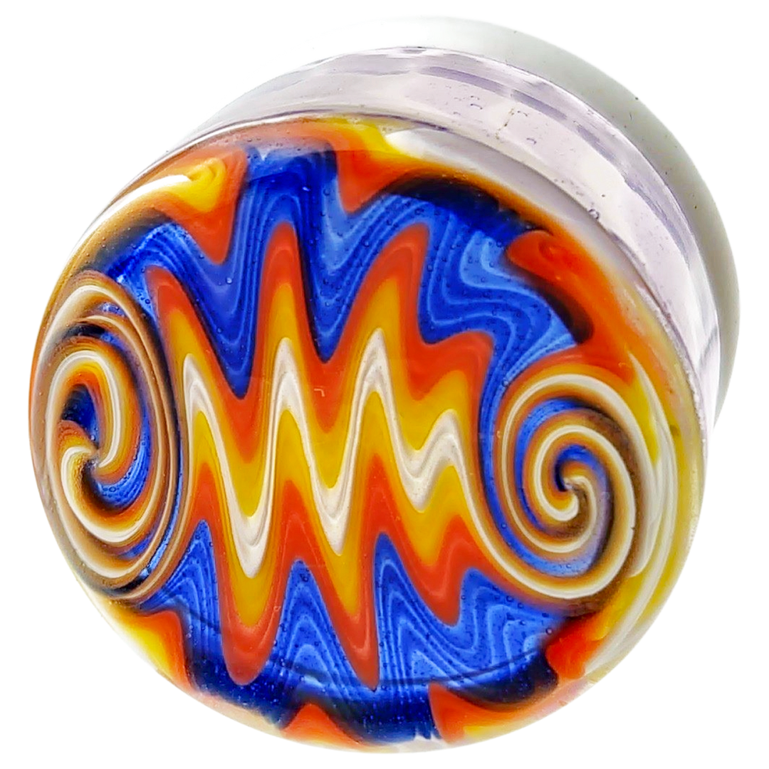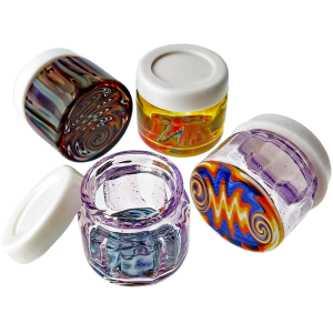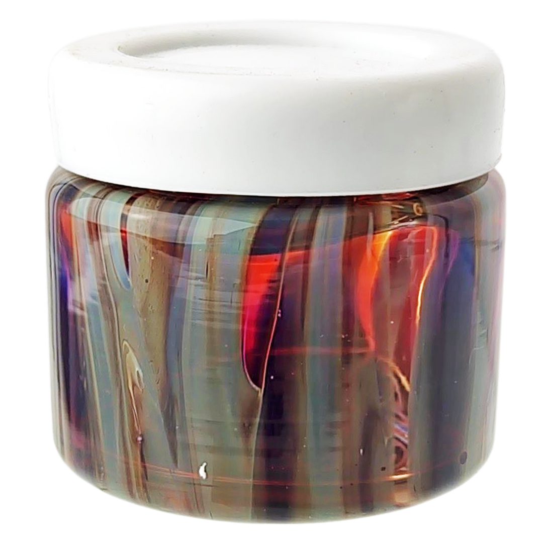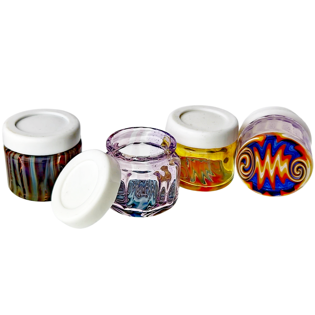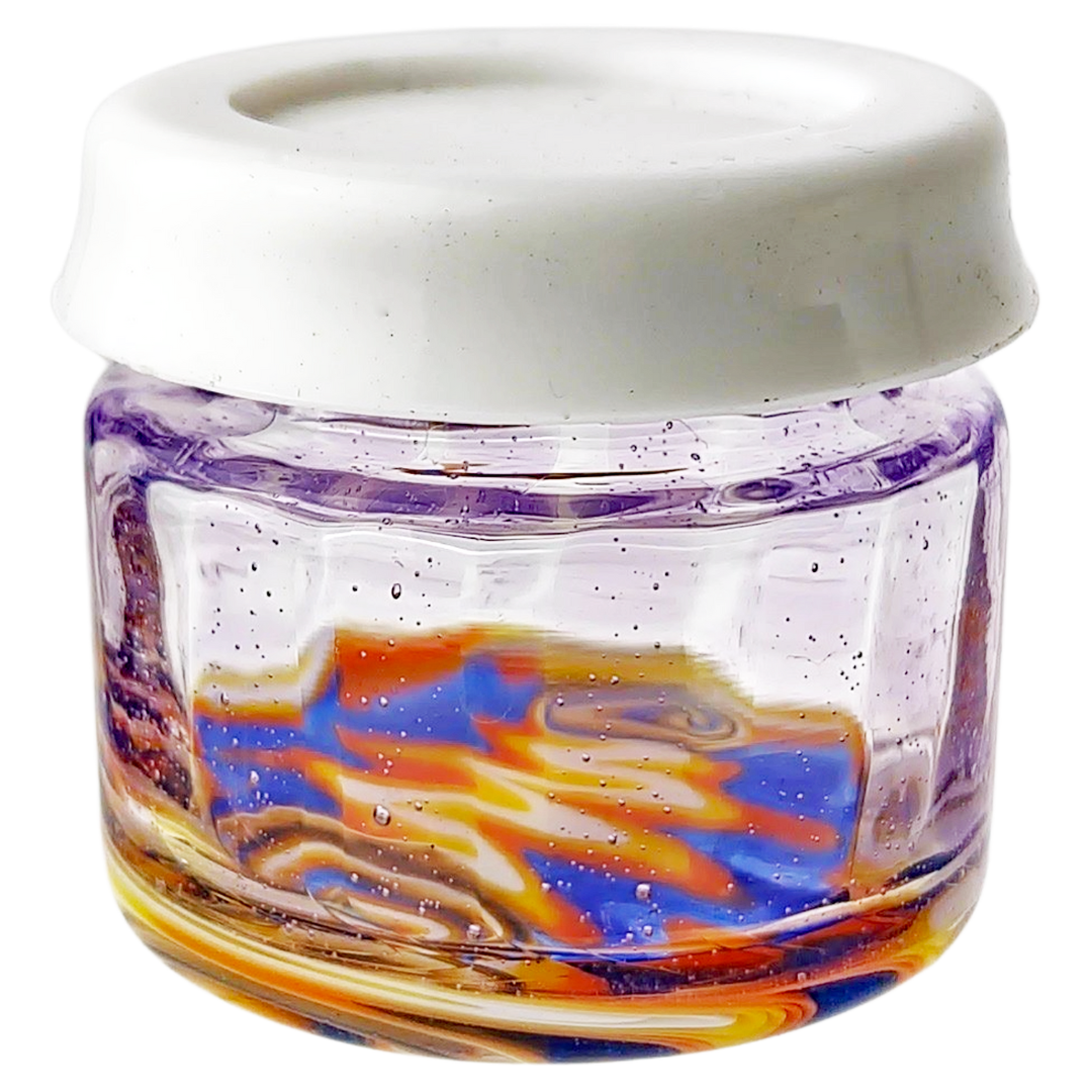 The 1.5" Wigwag Jar w/ Silicone Lid is a compact glass stash jar for people who actually care what their storage looks like on the table. It’s built for dabbers and flower heads who want a tight seal plus a loud, colorful wigwag pattern instead of another boring clear jar. At just 1.5 inches (38mm) tall with a snug silicone lid, it keeps small amounts fresh and easy to grab without taking over your whole stash drawer.