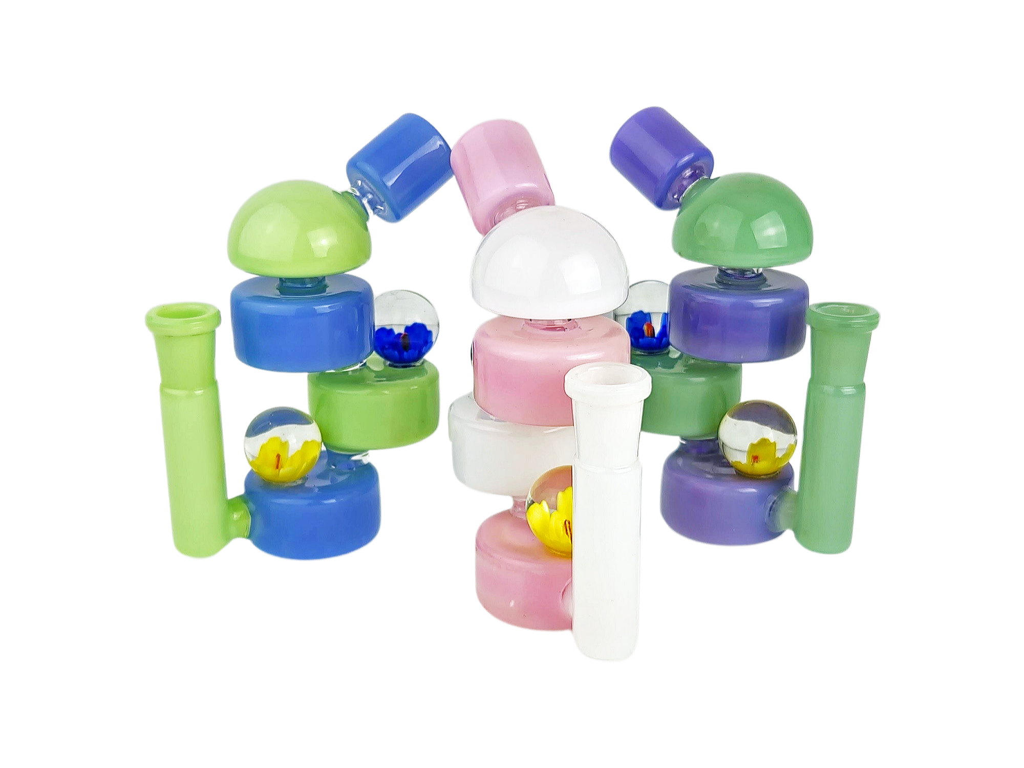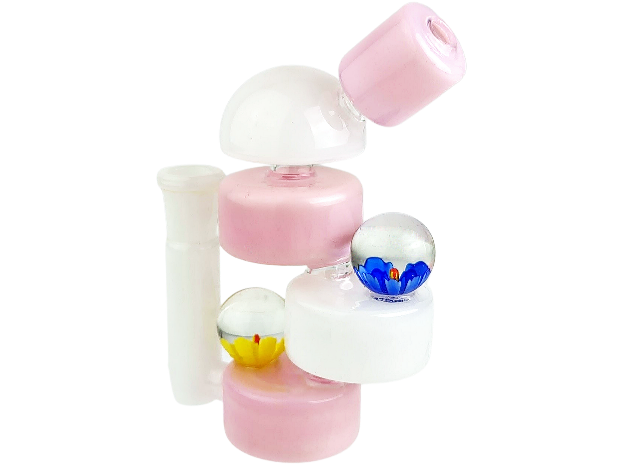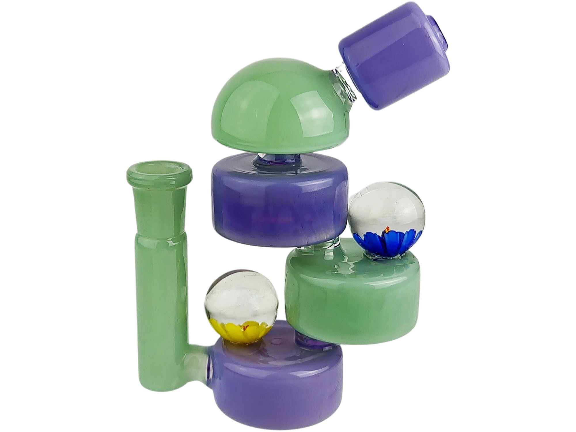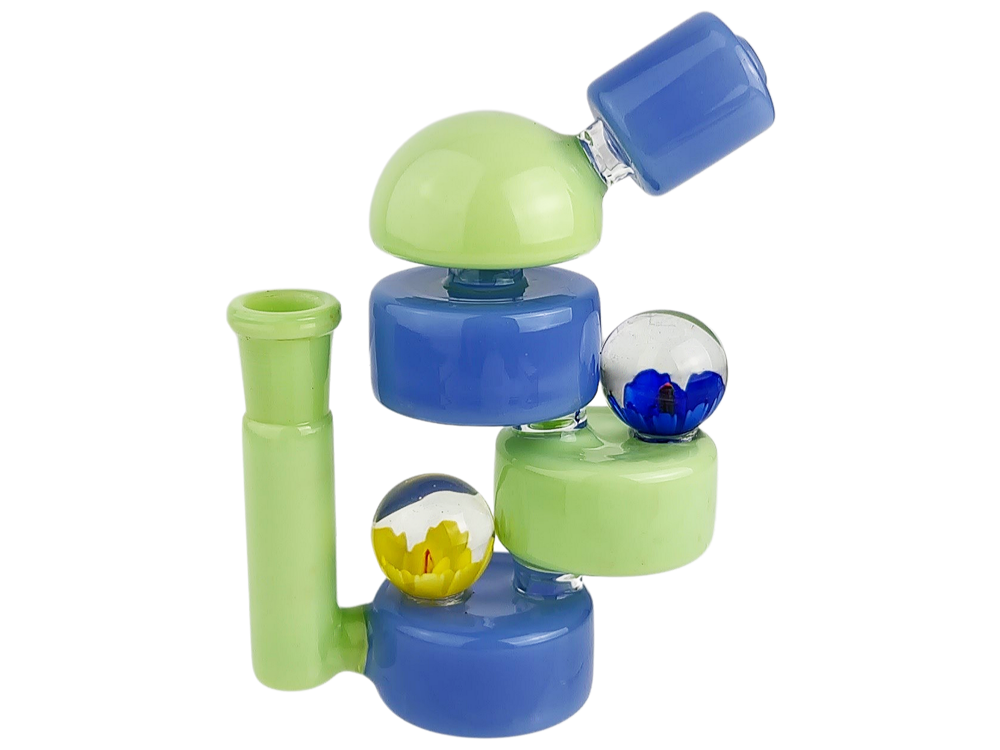 The flower implosion marbles bring legit heady energy without making the rig fragile or overly complex. They sit tucked into the body where they’re protected from bumps, but still front and center where you can zone out on them mid-sesh. Match that with the two-tone color work, and you’ve got a solid little centerpiece for a very reasonable price point.