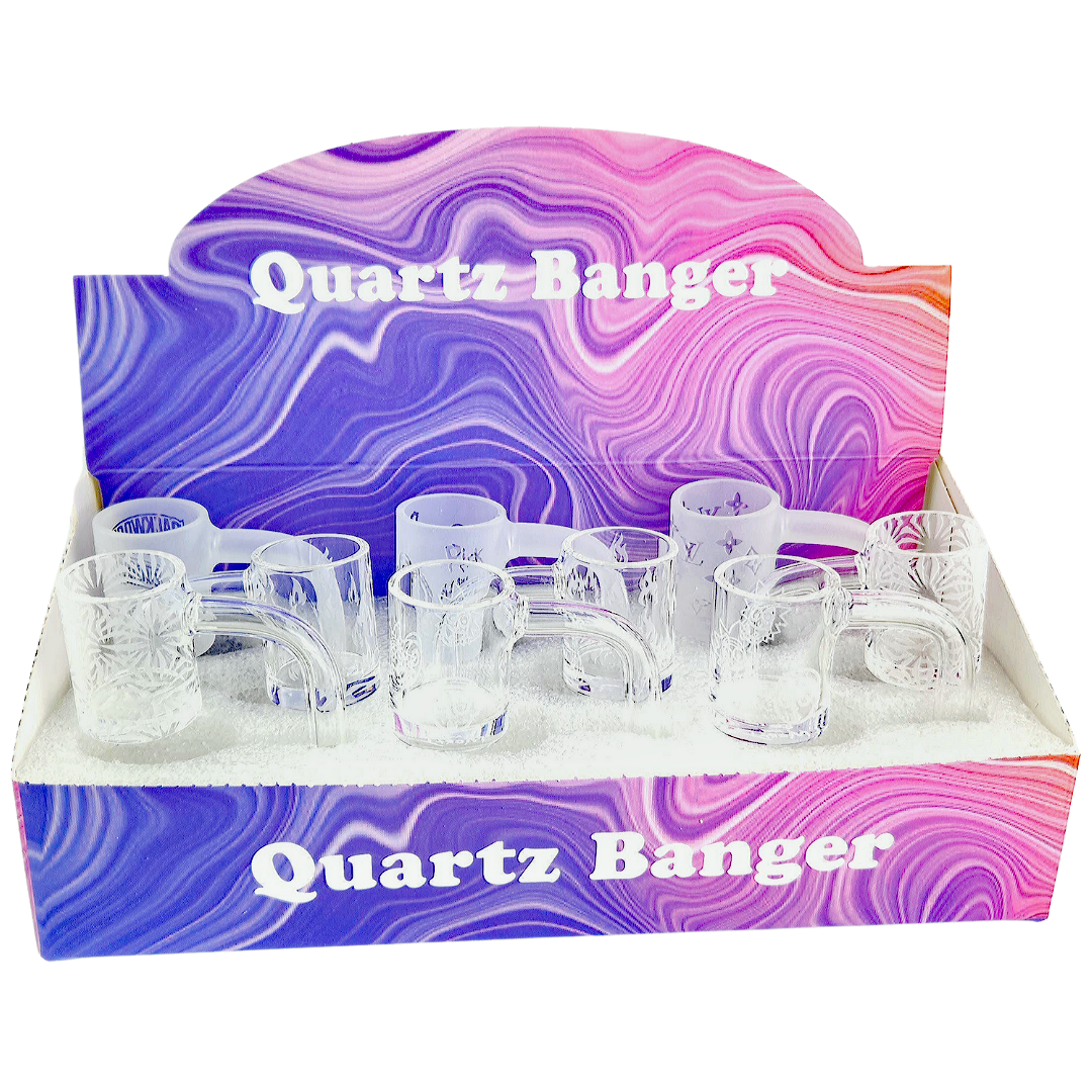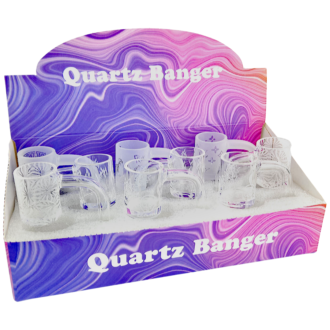 The 2.5″ 14M 90° Assorted Etch Quartz Banger 9pc Display Box is a quartz banger set built for dabbers and shops running 14mm female rigs all day. Each 2.5 inch (63.5mm) long, 90° banger has a 25mm bucket, giving you real room to work with your concentrates without easy spillover. You get nine etched quartz bangers in one display box, so you’re covered whether you’re stocking a counter or just want backups for heavy rotation.