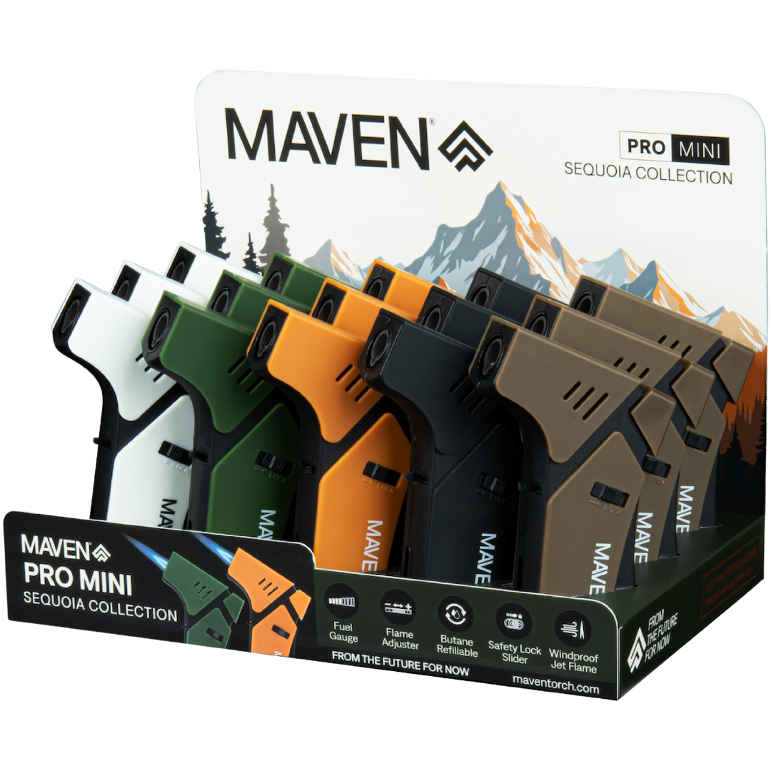 The 3" Maven Pro-Mini Sequoia Collection Torch Display is a compact torch lighter bundle built for smoke shops and heavy hitters who want dependable table lighters without taking up a ton of counter space. Each torch is small enough to palm but strong enough to light bowls, cigars, or tips consistently. You get 15 refillable, single-jet torches with a visible butane gauge and safety lock, all in one clean retail-ready display.