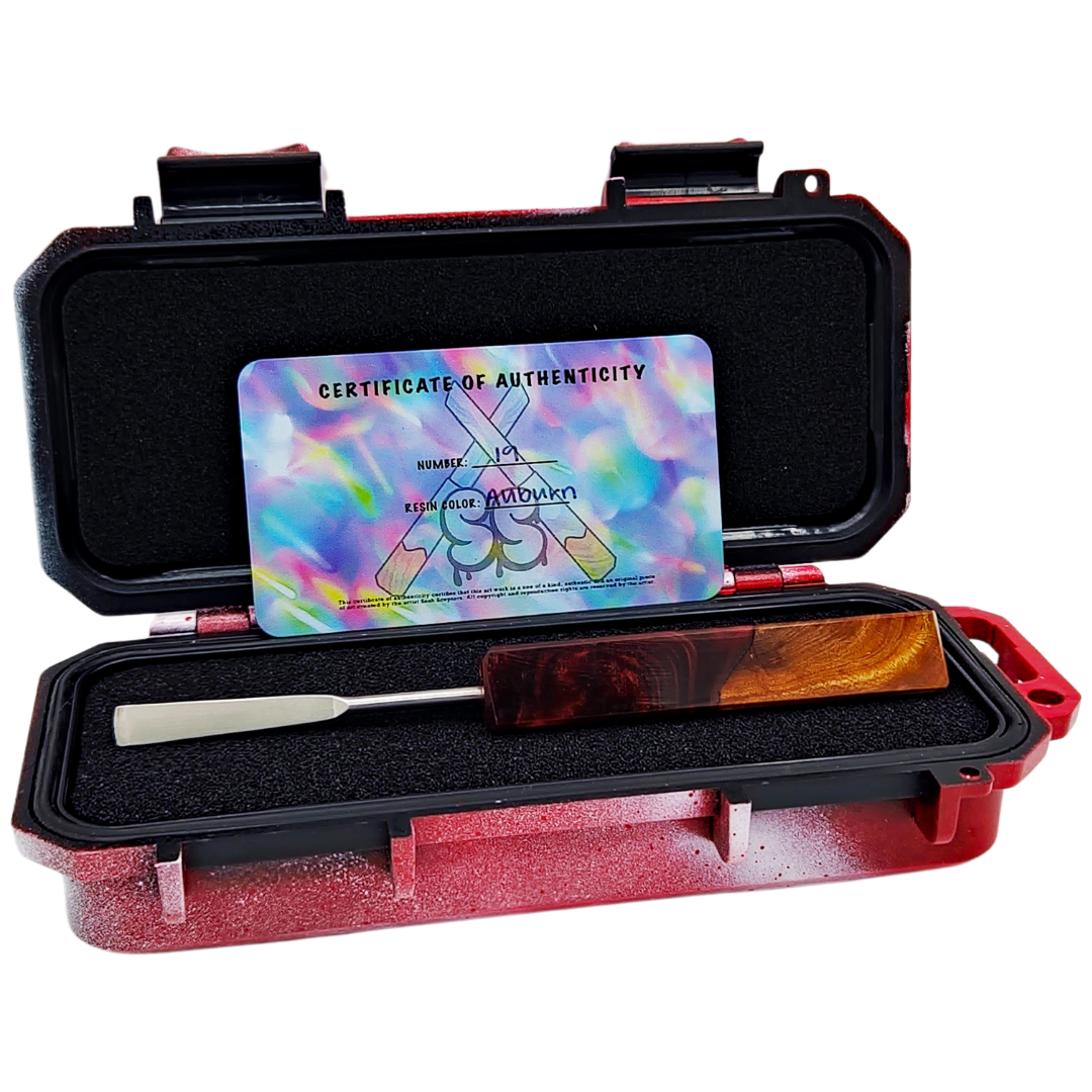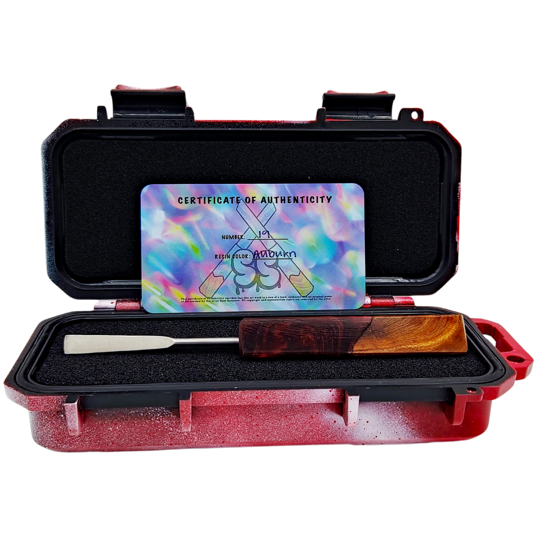 The MIYAGI PAINTS SQUARE SESH SCEPTOR Dab Tool in Auburn is a high-end, handcrafted dabber made for collectors and everyday dabbers who want their tool to look as good as their glass. With a wood burl and resin handle in a deep auburn finish, it’s built for people who care about grip, balance, and flexing a little every time they crack open the case. Each piece is a one-off collaboration with Miyagi Paints and comes with its own handwritten Certificate of Authenticity.