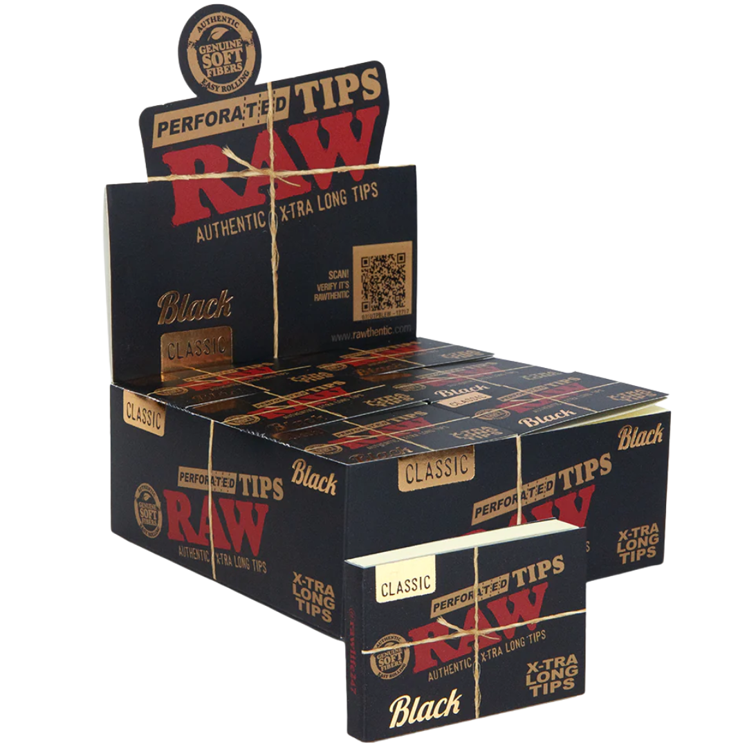RAW Black tips match the aesthetic of RAW Black rolling papers—they're unrefined and natural, just like the regular tips. The main difference here is the extra length and the perforation on one side. Both are chlorine-free and made from the same natural paper RAW is known for.