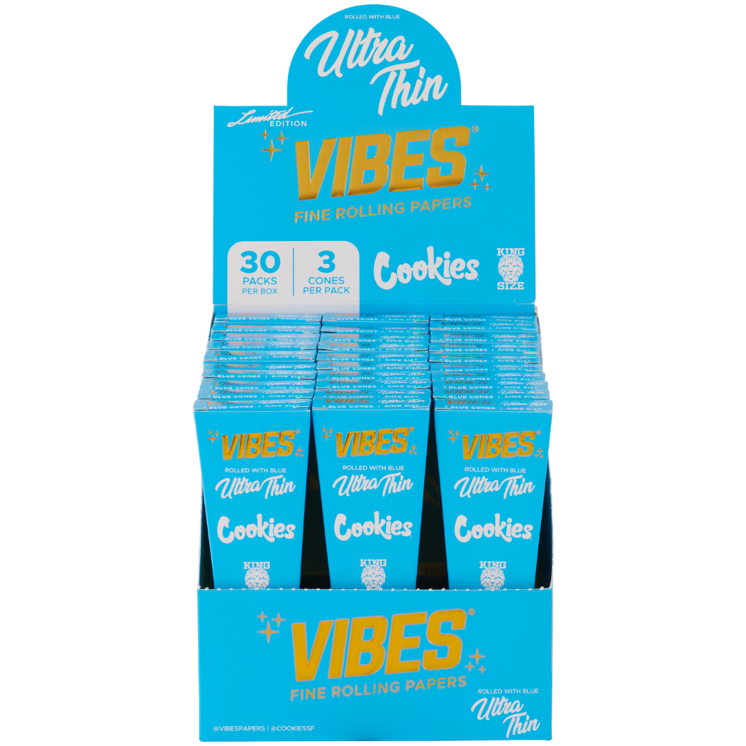 Whether you’re rolling slow burners for the whole crew or dialing in personal king size cones, the VIBES X Cookies King Size Slim Ultra Thin – Blue display box keeps you stocked with clean-burning, good-looking papers that do your flower justice.