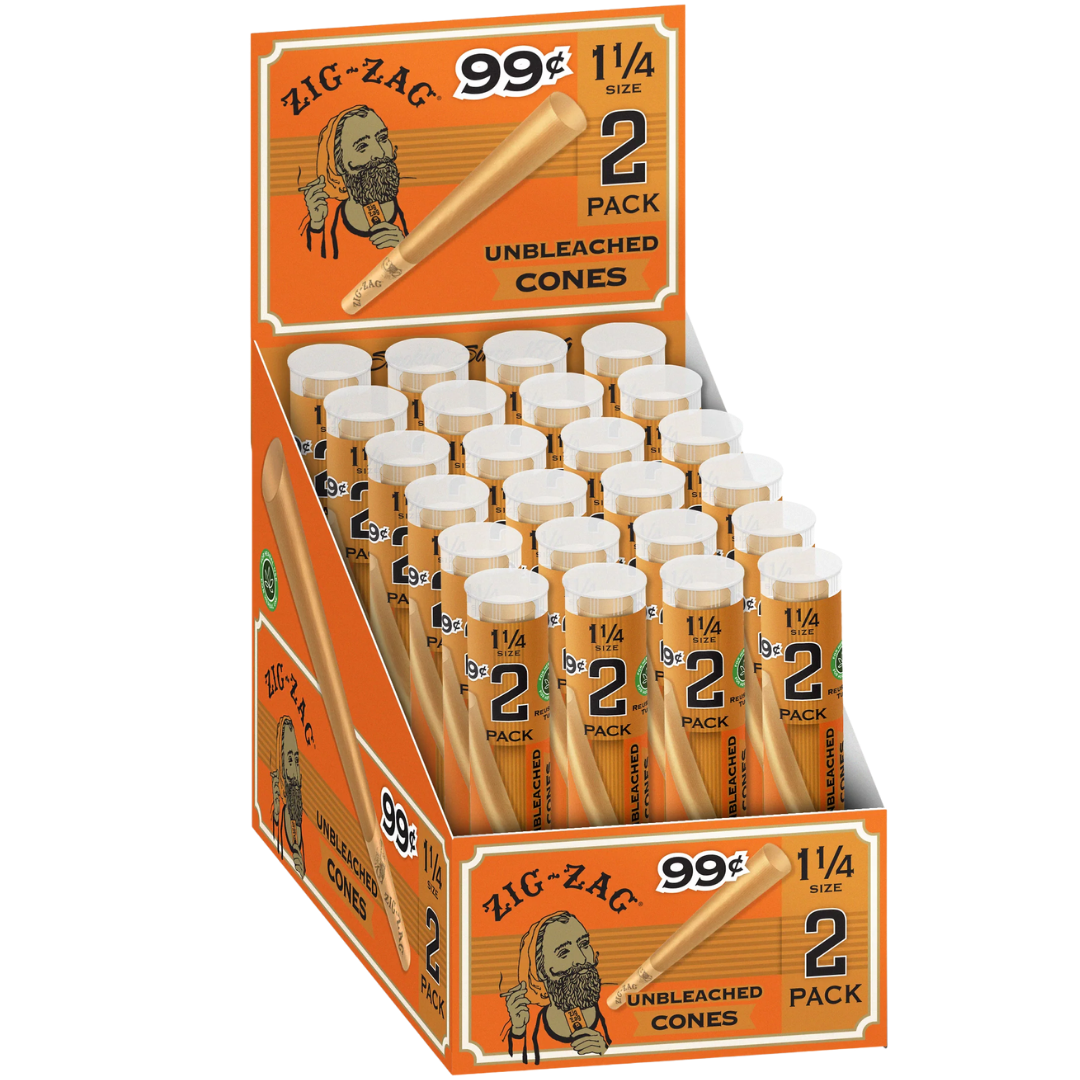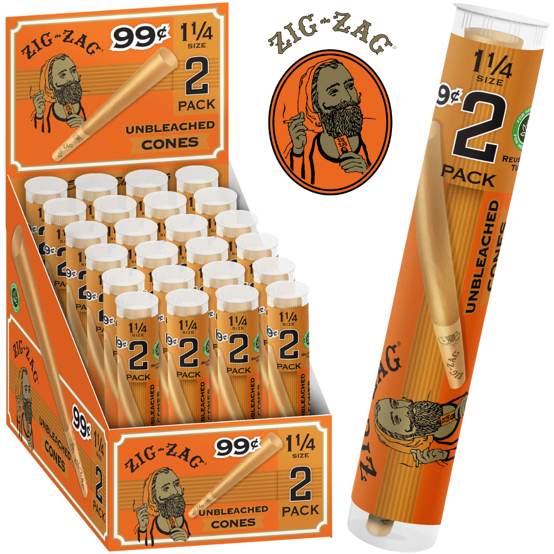 Zig Zag 1¼ Unbleached Paper Cones are pre-rolled and ready to pack, sold two per tube. These are for smokers who want consistent cones without the rolling learning curve. Natural unbleached paper skips the chlorine processing — just wood pulp and a slow, even burn that lets your flower's flavor come through. This 24-tube display box holds 48 cones total, built for retailers stocking counters or individual smokers who'd rather buy once and forget about it for a while.