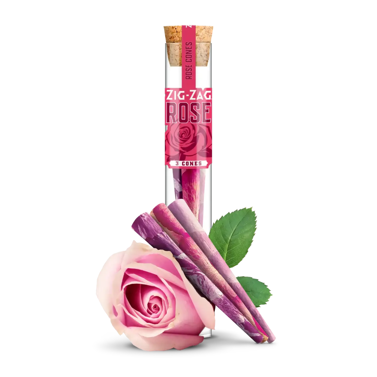 The Zig Zag 3 Pack Rose Cones Carton is a wholesale bulk option for shops stocking premium tobacco-free smoking cones made from real rose petals. Each carton contains 8 protective tubes, and each tube holds 3 hand-crafted rose cones (109mm), a packing tool, and a humidity control pack to keep petals fresh. These cones combine Zig-Zag's classic unbleached cone structure with naturally grown rose petals for a smooth, aromatic alternative to traditional papers.