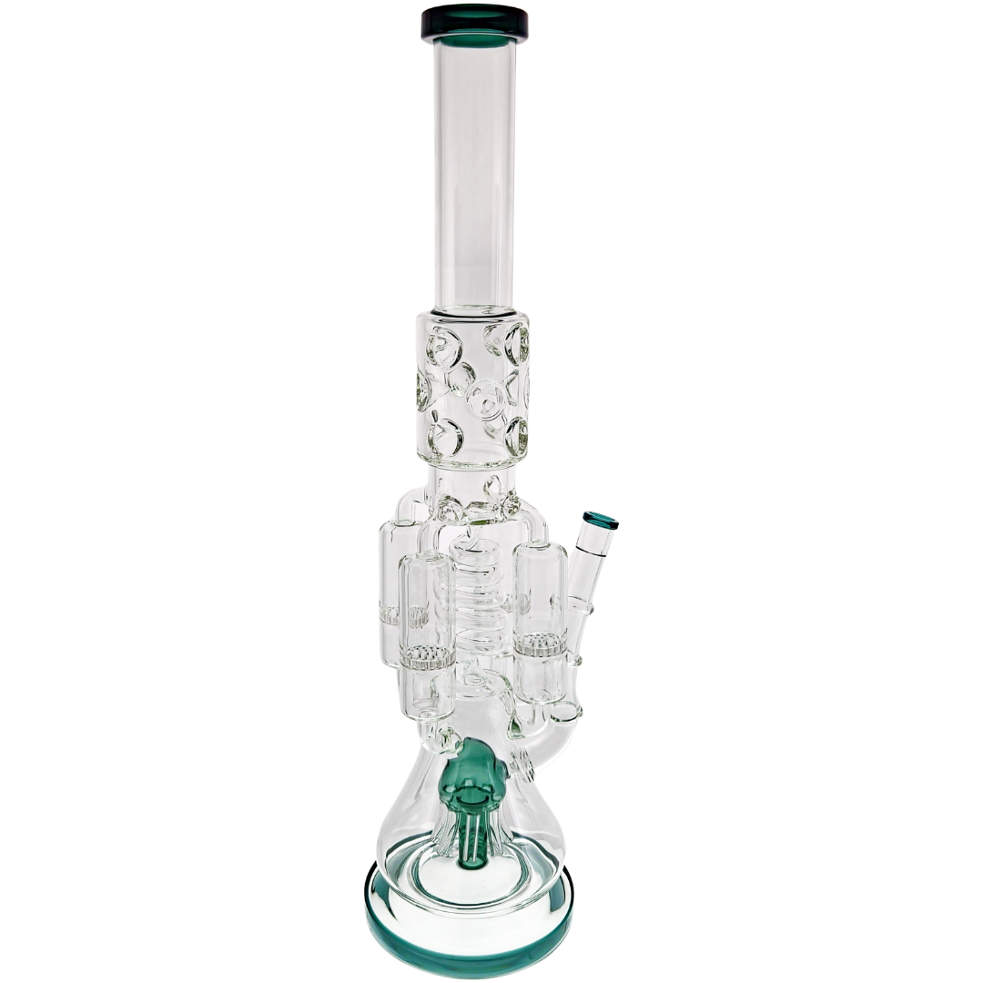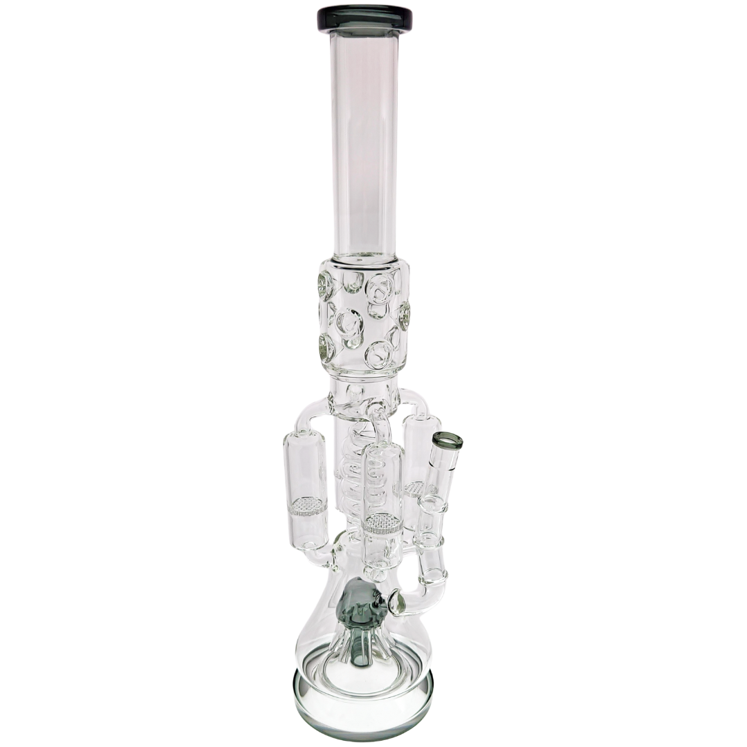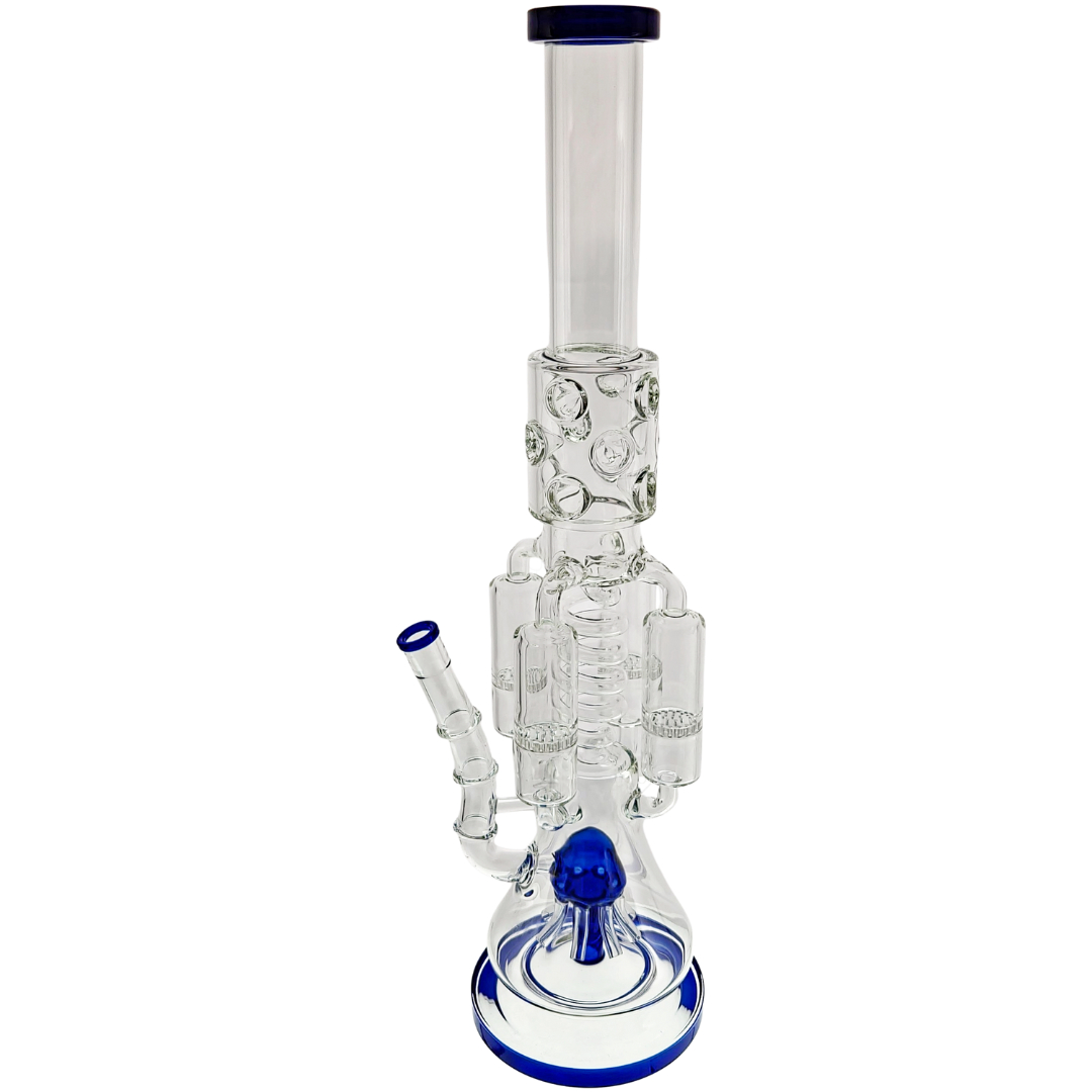 The 21" Quad Capsule Recycler Beaker is a glass water pipe built for dabbers and flower smokers who want serious filtration without sacrificing flavor. At 21 inches tall, this beaker base rig combines a jellyfish perc with a quad honeycomb capsule system to cool and filter smoke through multiple stages, while the recycler-style drain keeps water circulating for smoother hits. Color-accented details on the lip, foot, perc, and joint give it a clean look that stands out on any table.