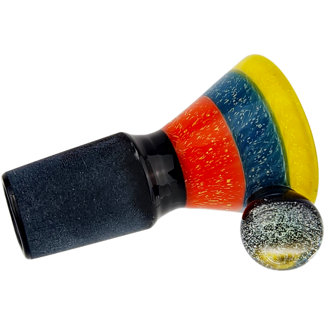 The 2" 18MM Four Color Dichro Sleeve & Dichro Marble Flower Bowl is a heady glass flower bowl built for people who care about function and drip. It snaps into any 18mm female joint and stands about 2 inches (50.8mm) tall, giving you a comfy grip and an easy-to-pack bowl. The dichro sleeve and matching dichro marble turn every hit into a little light show without complicating your setup.