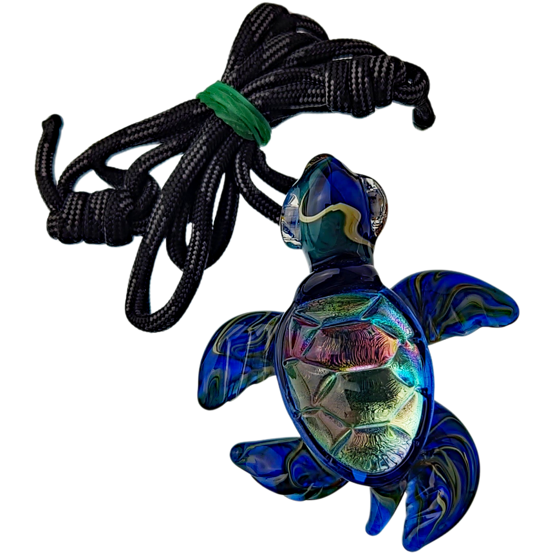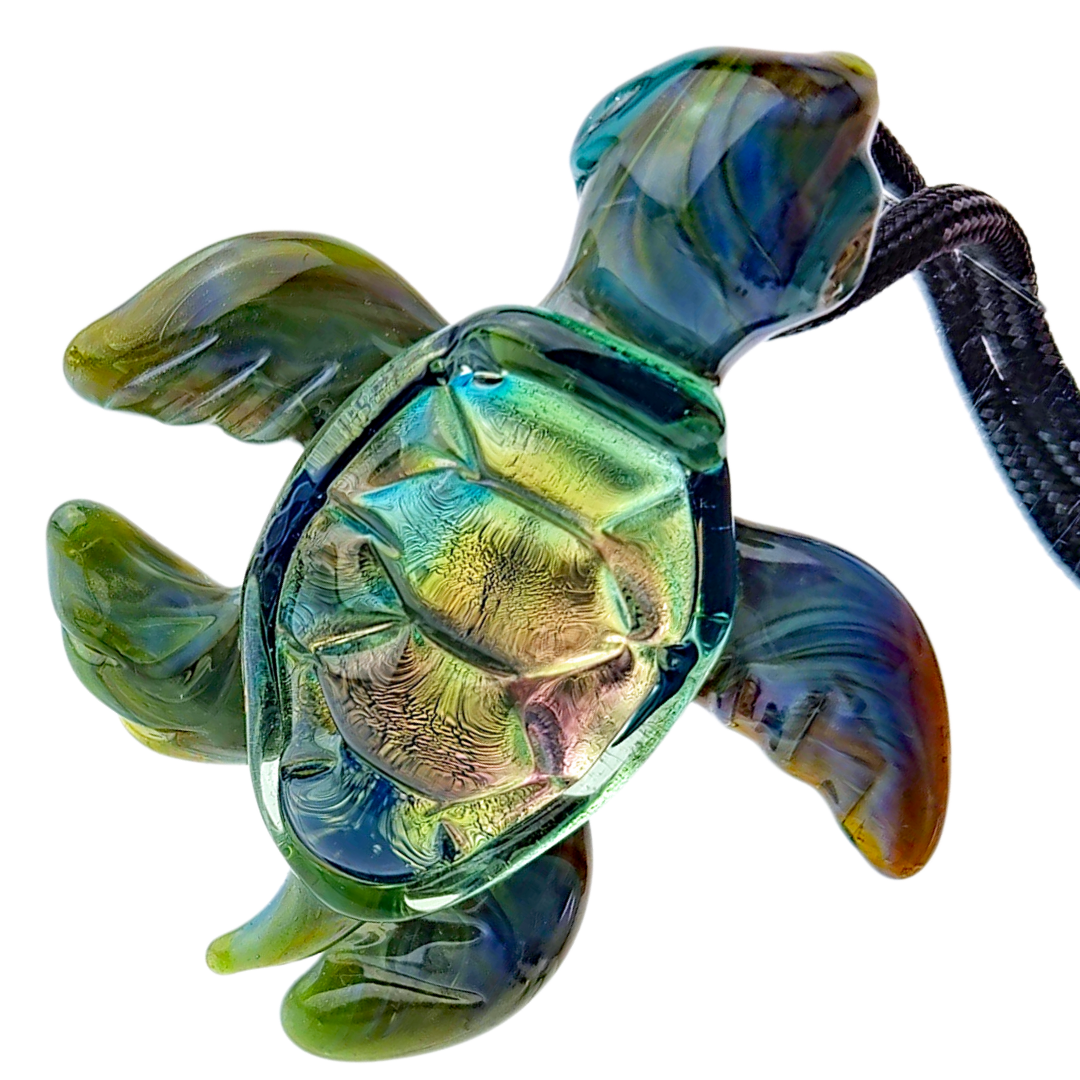Dichroic glass is where the magic happens here. It’s a special glass that reflects and transmits different colors at the same time, so when light hits the turtle’s shell and body, you get layers of sparkle and shifting tones. In a sesh room or under sunlight, it really comes alive.