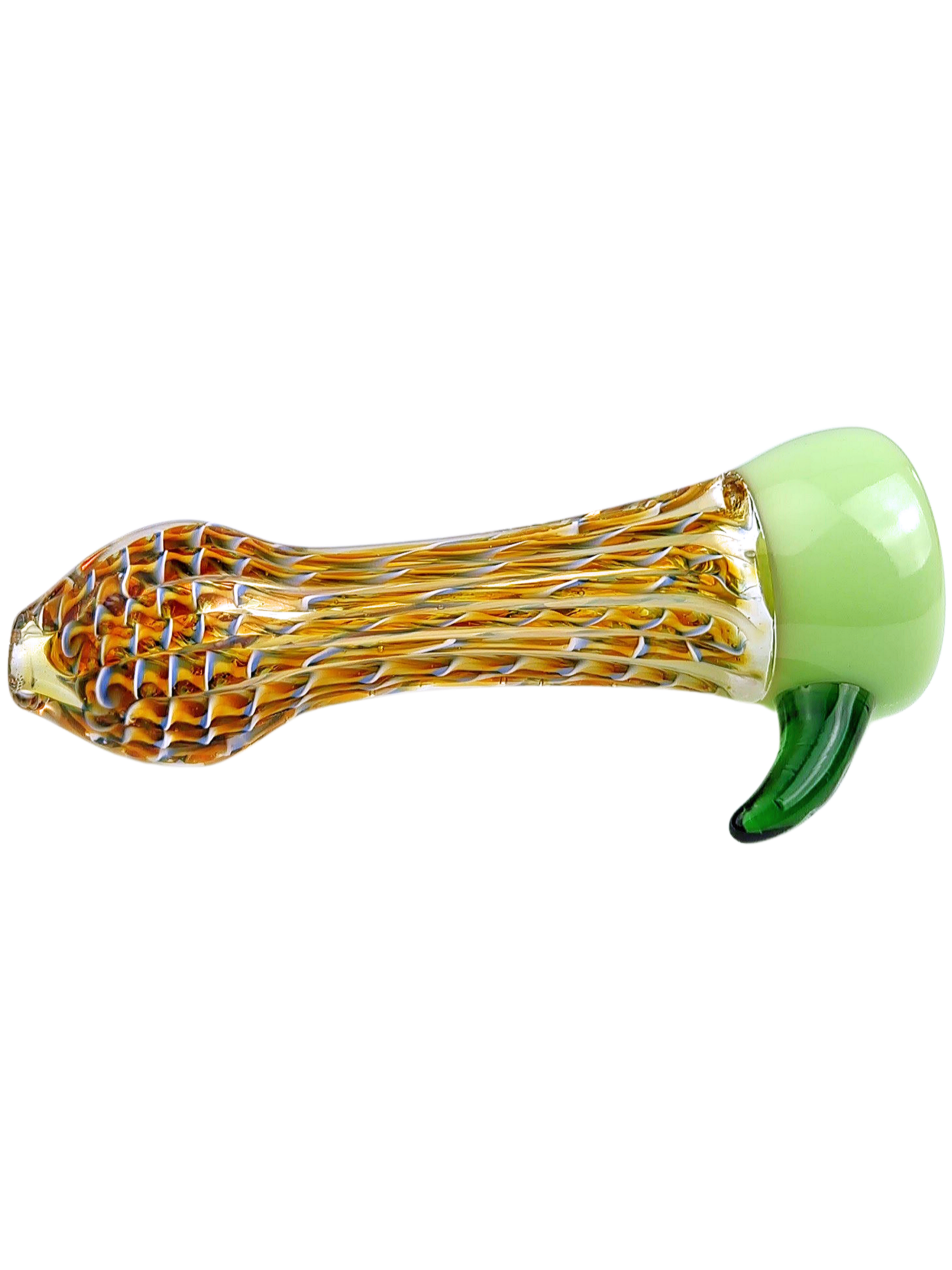 Because of the twisted cane work and fume finish, each piece will have its own character in the lines, color distribution, and horn accent. If you like glass with a bit of individuality, this fits right in alongside more custom-looking portable pieces.
