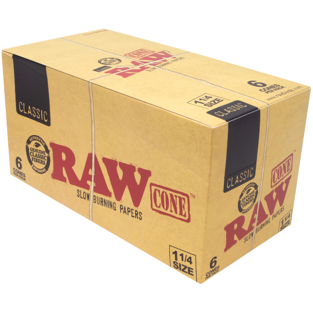 The RAW Classic 1¼ Pre-Rolled Cones are pre-shaped papers built for people who want to skip the rolling grind and get straight to smoking. Each pack holds 6 cones, and this bulk box ships with 32 packs — 192 total cones. These are RAW's signature unrefined brown paper, unbleached and additive-free, so you taste your flower instead of whatever chemicals bleach might leave behind.