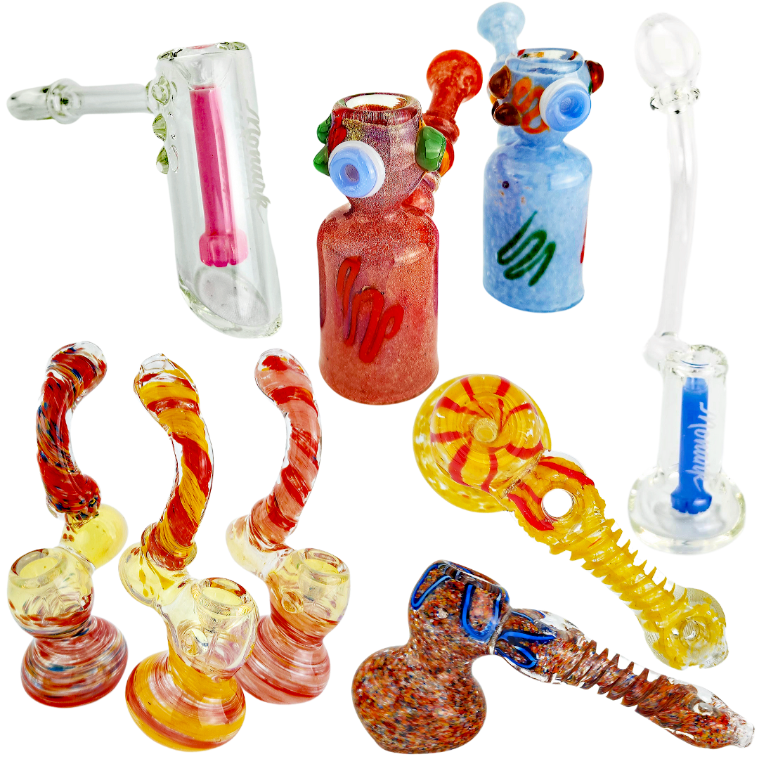 - A mixed pack of high-quality glass bubblers with varied shapes and styles
