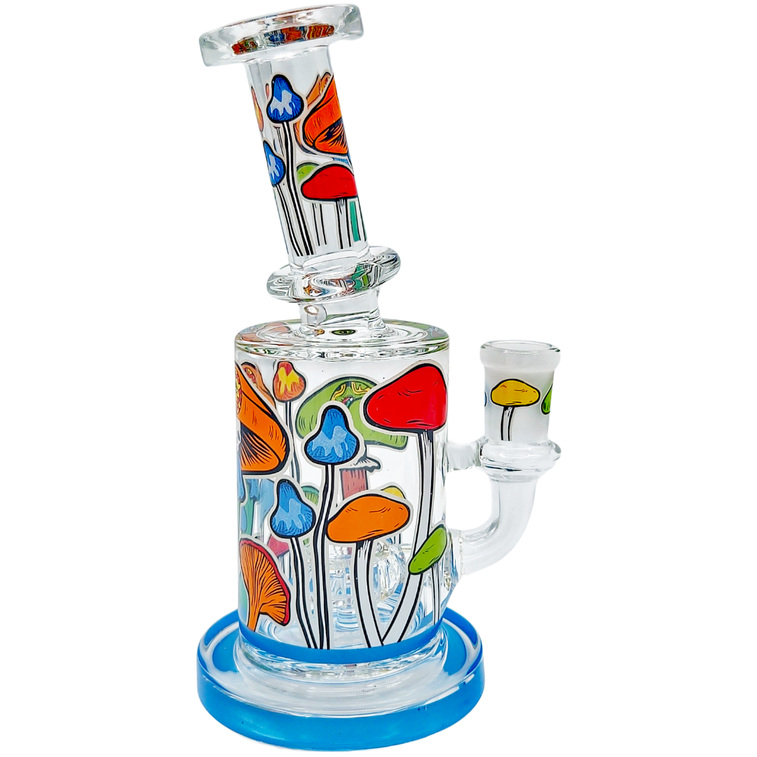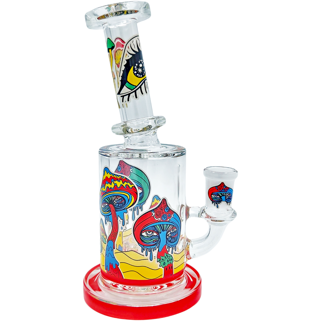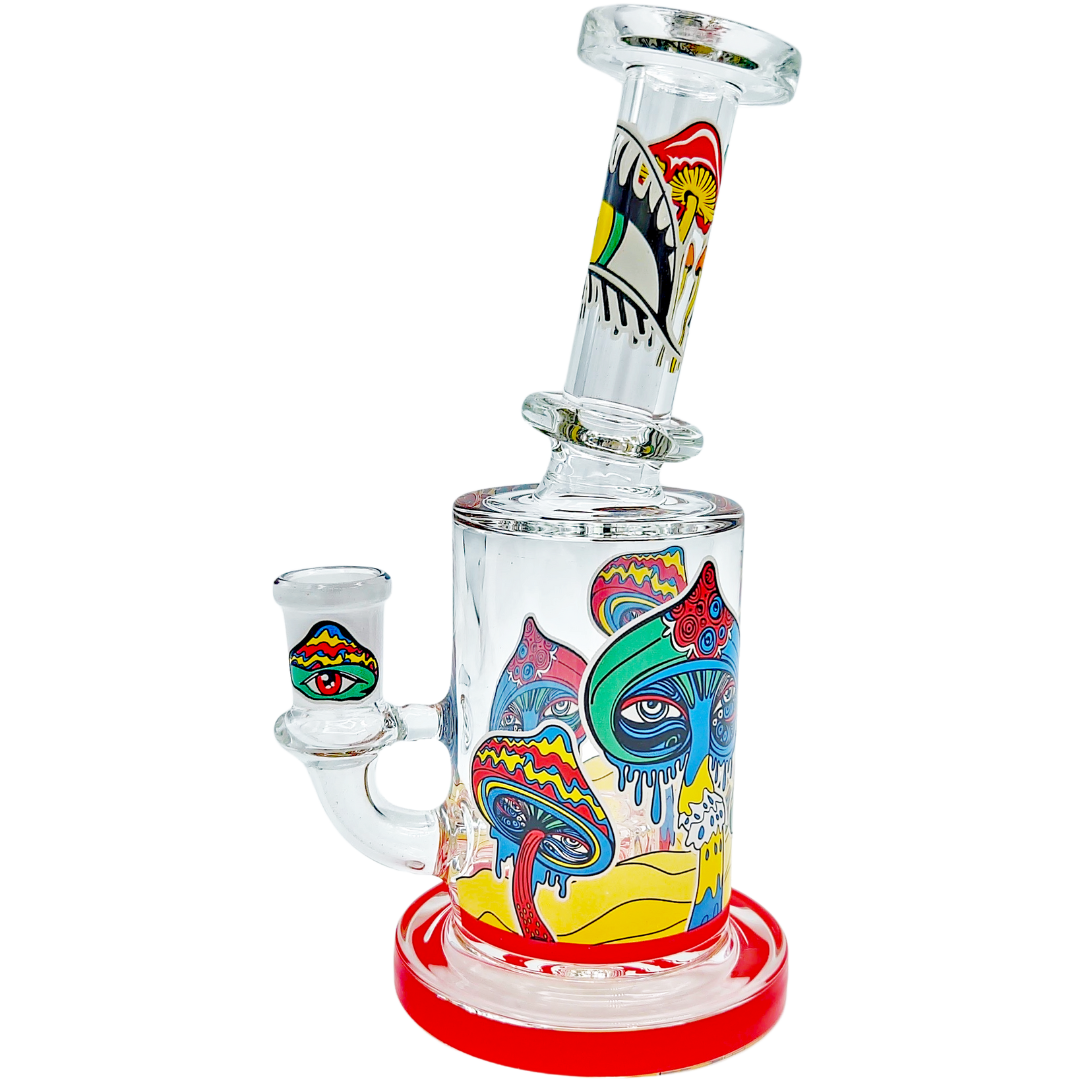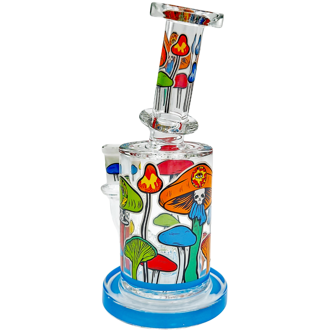 The 6.5" Mushroom Glow Decal Rig is a compact glass dab rig built for concentrate lovers who like a little trippy artwork with their function. At 6.5 inches (165mm), it’s small enough to be a daily desk piece but still big enough for the showerhead perc to actually cool things down. Glow-in-the-dark mushroom decals wrap the neck and can-style body, so your rig still looks alive when the lights go low.