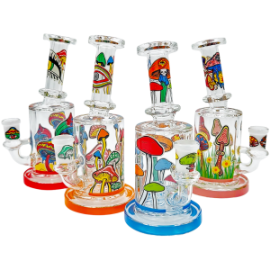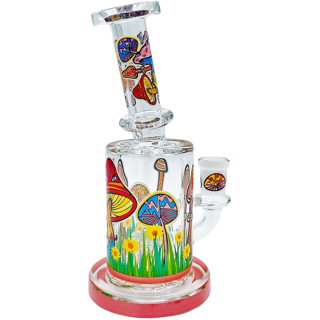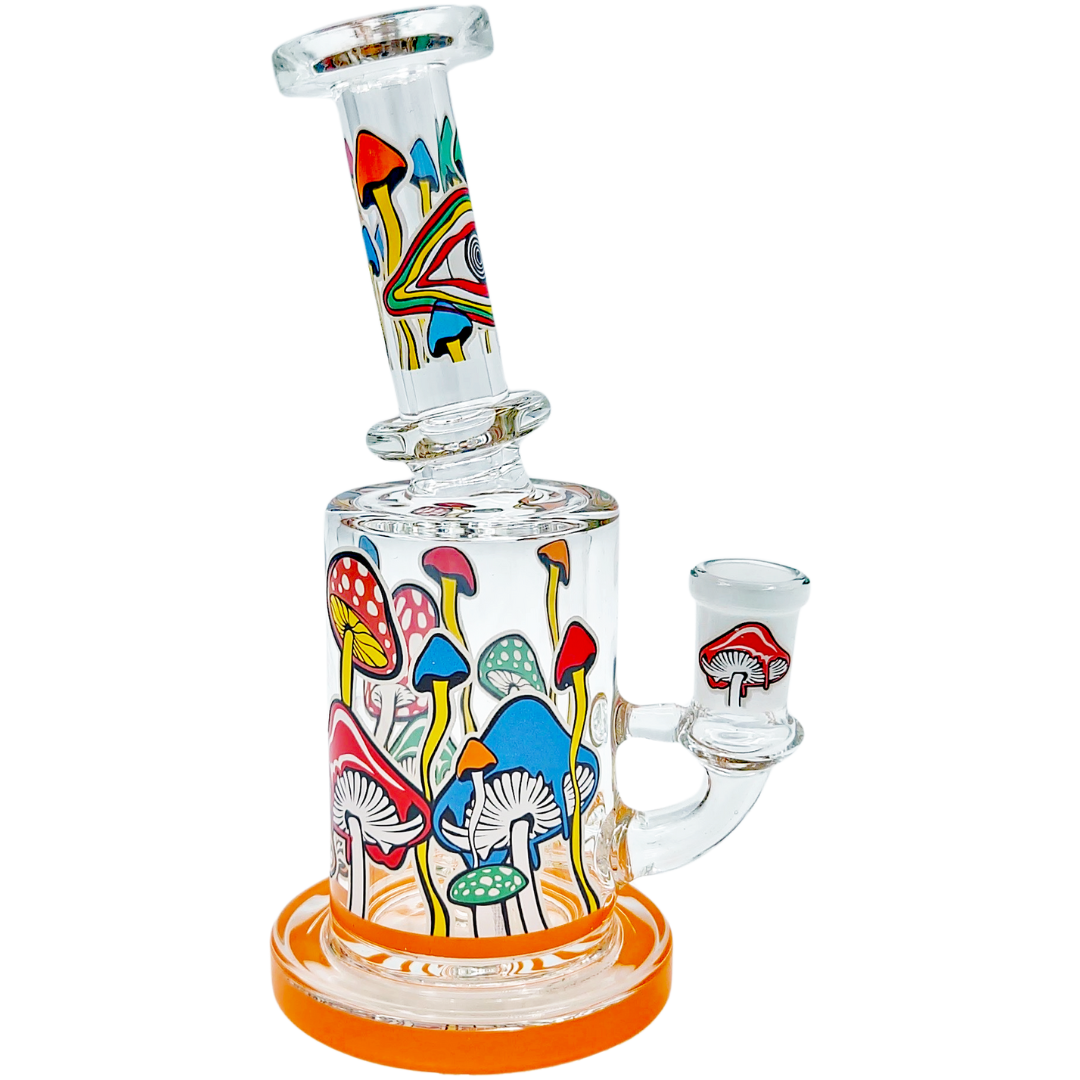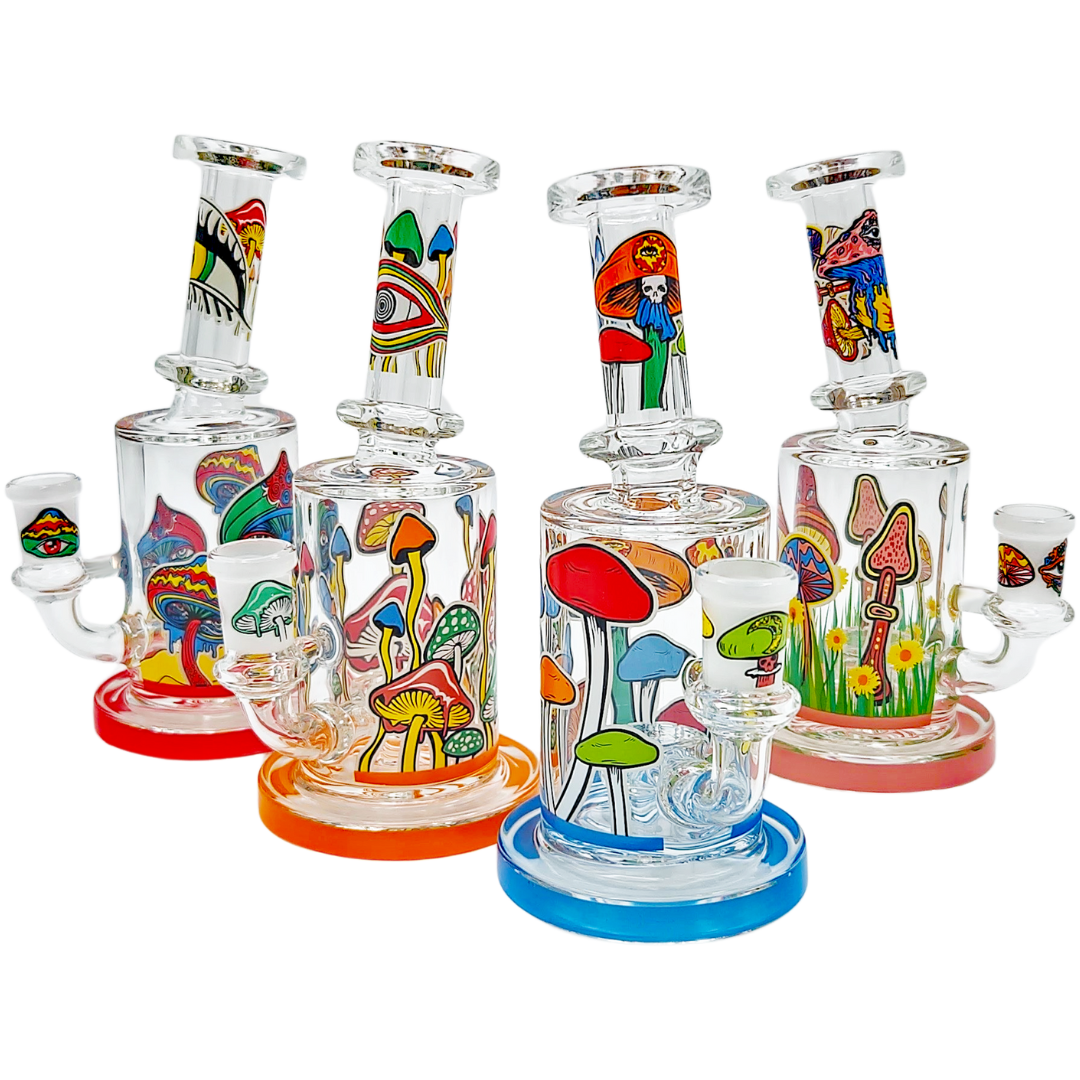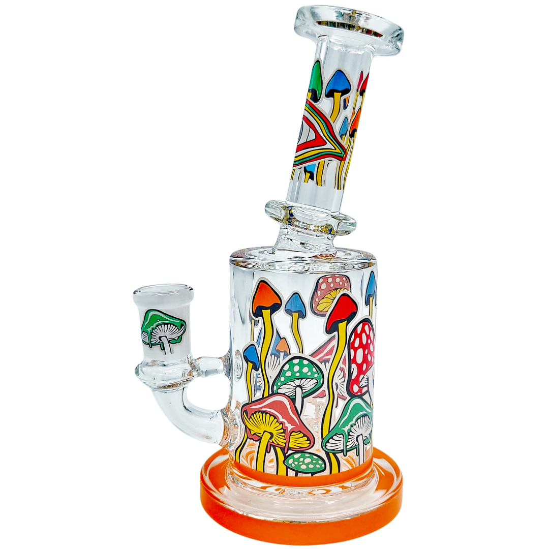 The 6.5" Mushroom Glow Decal Rig is a compact glass dab rig built for concentrate lovers who like a little trippy artwork with their function. At 6.5 inches (165mm), it’s small enough to be a daily desk piece but still big enough for the showerhead perc to actually cool things down. Glow-in-the-dark mushroom decals wrap the neck and can-style body, so your rig still looks alive when the lights go low.