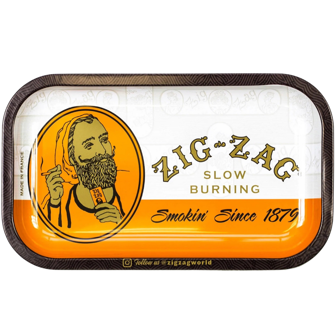 The Zig-Zag Small Rolling Tray in the classic orange design is a compact metal tray built for rollers who want a dedicated workspace without taking over the whole table. At 10.65 by 6.30 inches, it's sized right for personal sessions — big enough to spread out your materials, small enough to stash in a drawer or slide under the couch when company comes over.