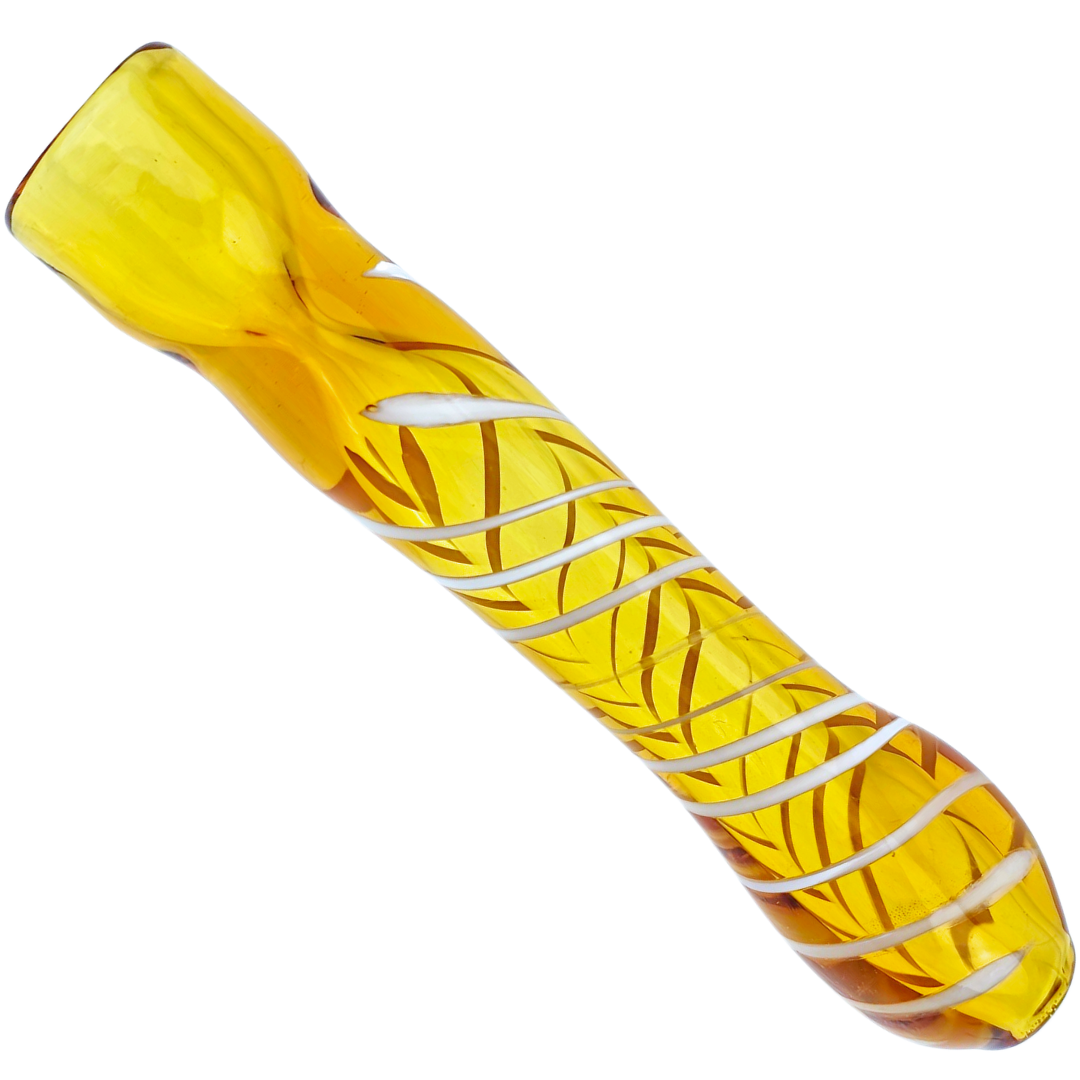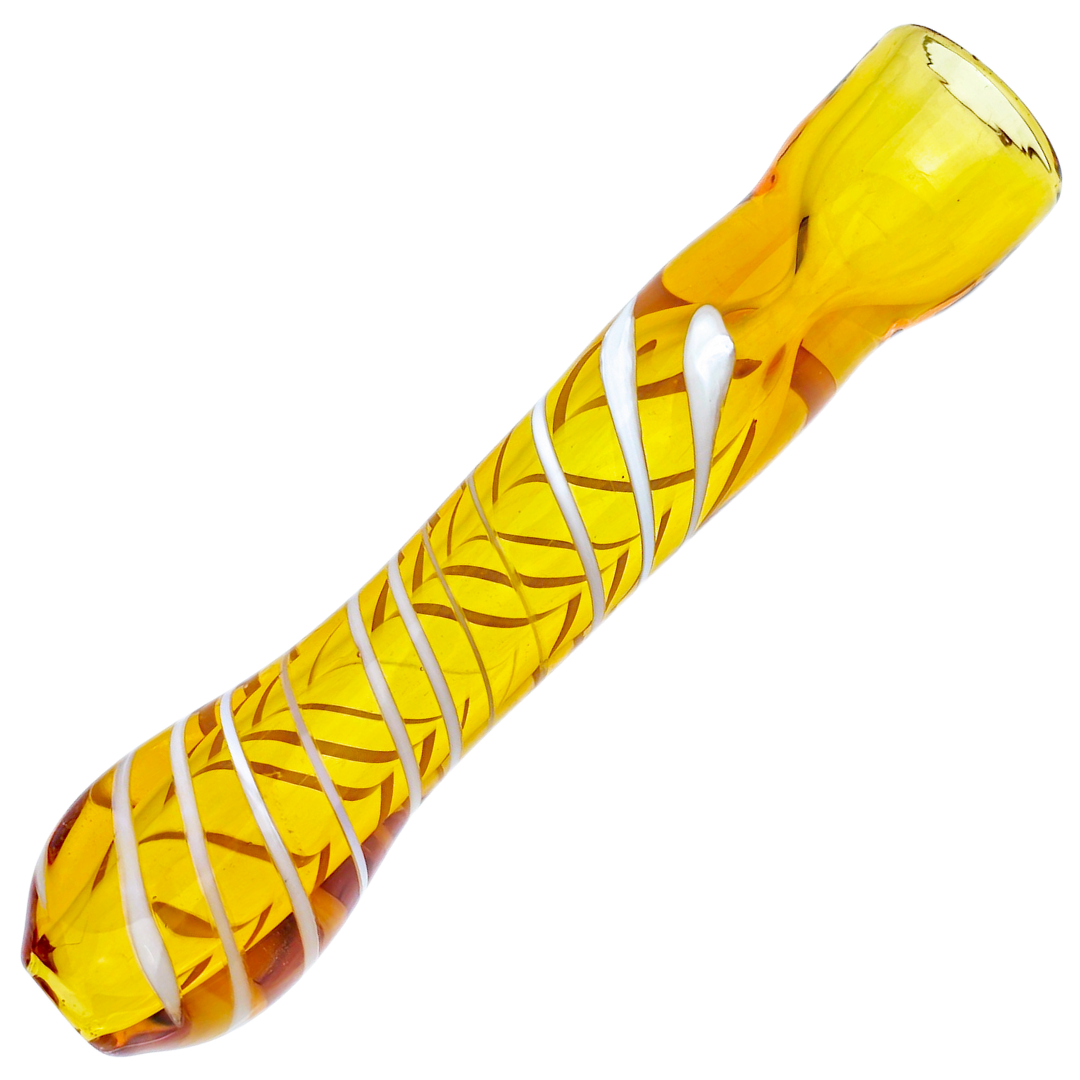 | Design | Straight tube chillum with white swirl on colored glass |