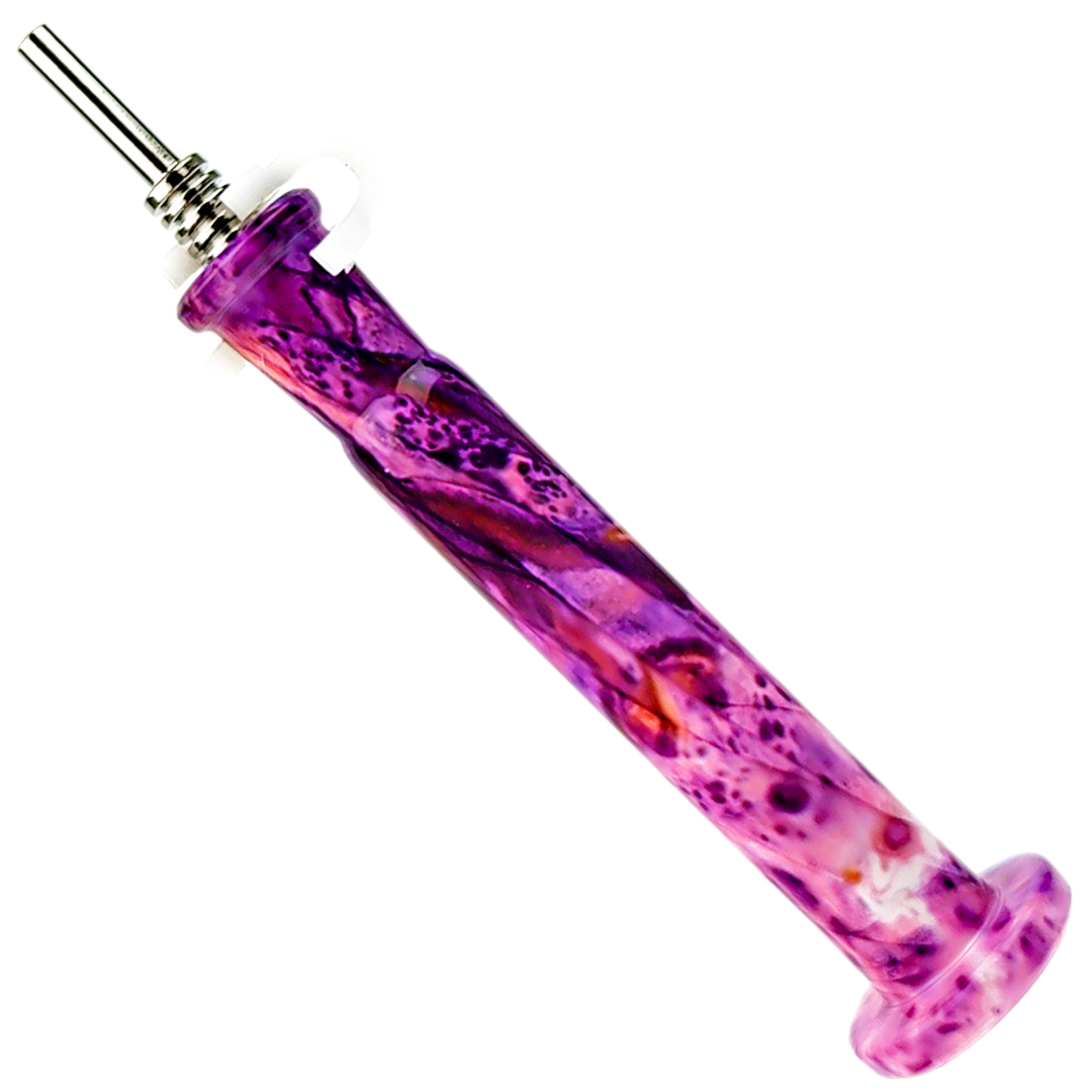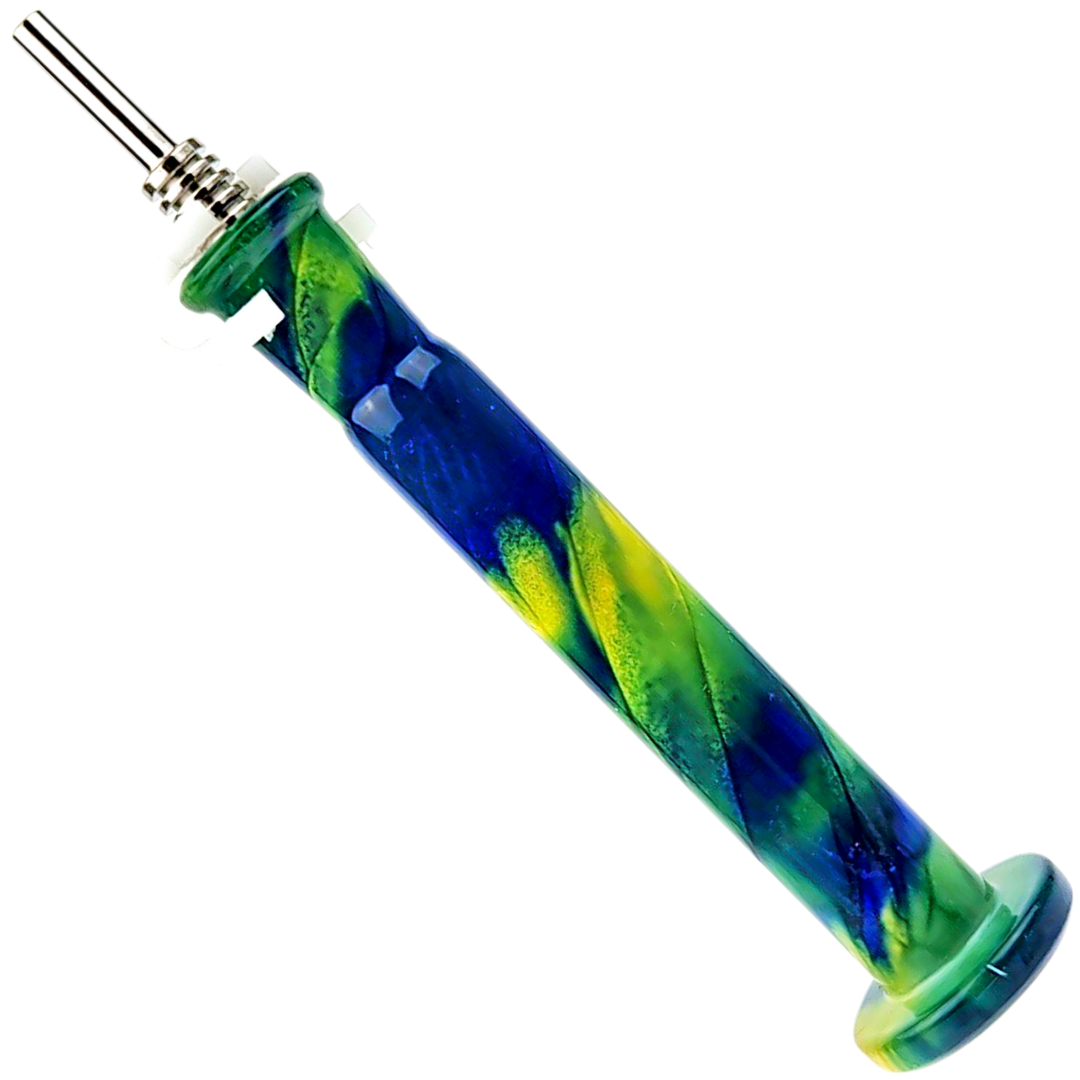 The 5" Watercolor Nectar Straw is a compact glass dab straw built for concentrate enthusiasts who want a portable, no-fuss setup. It comes ready to use with a 10mm titanium tip and plastic clip included, so you're not hunting for parts before your first session. The watercolor glass design means each piece has its own color pattern — no two look exactly alike.