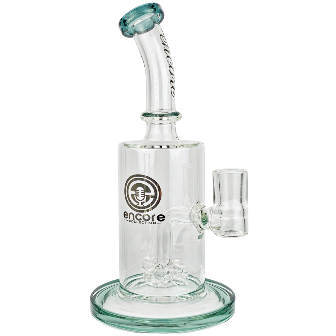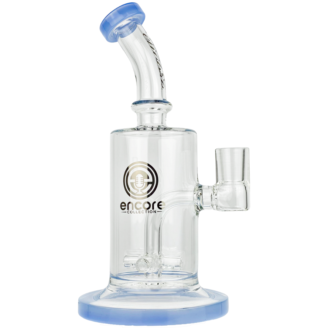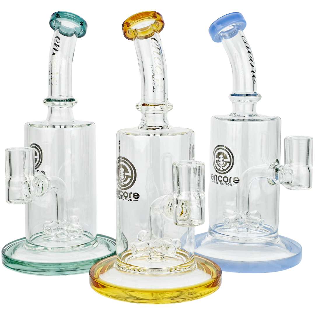 The Encore 8-inch Chopper Perc Rig is a compact dab rig built for dabbers who want smooth, cooled hits without a complicated setup. Standing 8 inches tall with a chopper percolator for diffusion, this rig comes ready to use with a 14mm male 90-degree quartz banger included. The colored lip and foot accents add personality to the clear glass body, making it a solid choice for daily sessions or as a starter rig for someone moving up from a nectar collector.