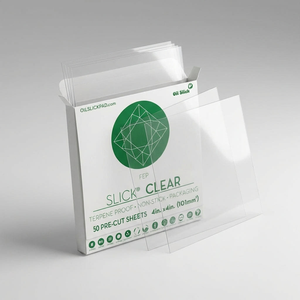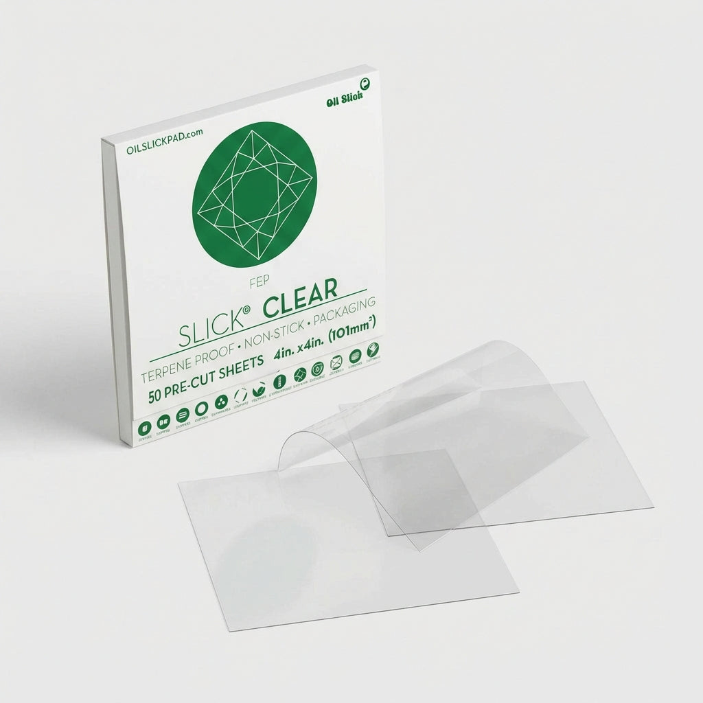 The Oil Slick® Clear 50 Sheet pack is a bulk FEP sheet solution built for concentrate brands, processors, and headshops that resell nonstick sheets to their own customers. Each consumer-ready pack comes pre-counted with fifty 4 inch x 4 inch (10.2cm x 10.2cm) sheets, so your team can skip trimming, measuring, and hand-counting and just put product on shelves or into kits. If you’re moving a lot of extract and need clean, consistent presentation without babysitting every pack, this is the set-it-and-forget-it option.